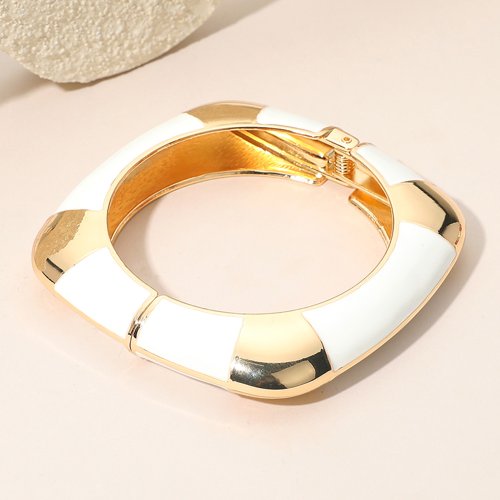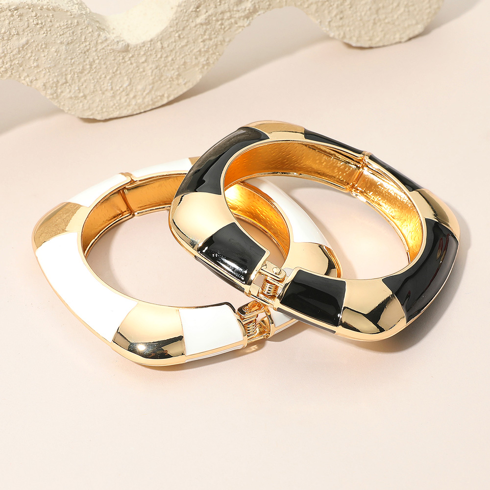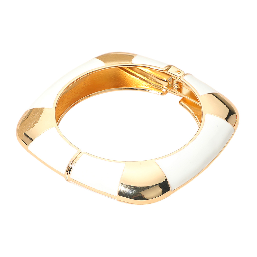 Details • Size : 0.6" H, 2.3" D • Hinged Closure • Modern striped hinged bangle bracelet designed to elevate your everyday or evening outfits. With its sleek geometric accents and secure fit, this versatile accessory adds a statement touch to any wardrobe, perfect for stacking or wearing solo.