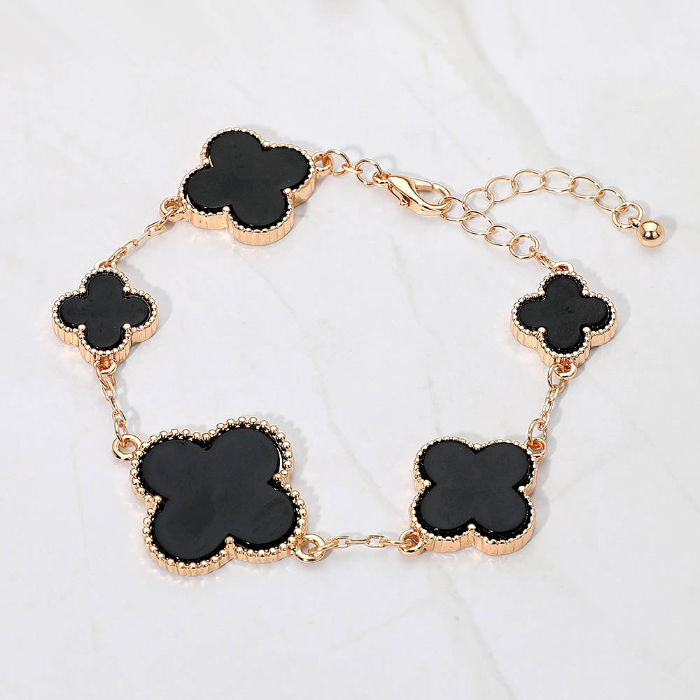 • Chic bracelet featuring five quatrefoil-shaped charms linked along a sleek gold chain. With a mix of small and large motifs, it adds elegance and versatility to any outfit. Perfect for layering or wearing solo, this timeless accessory complements both casual and formal looks effortlessly.