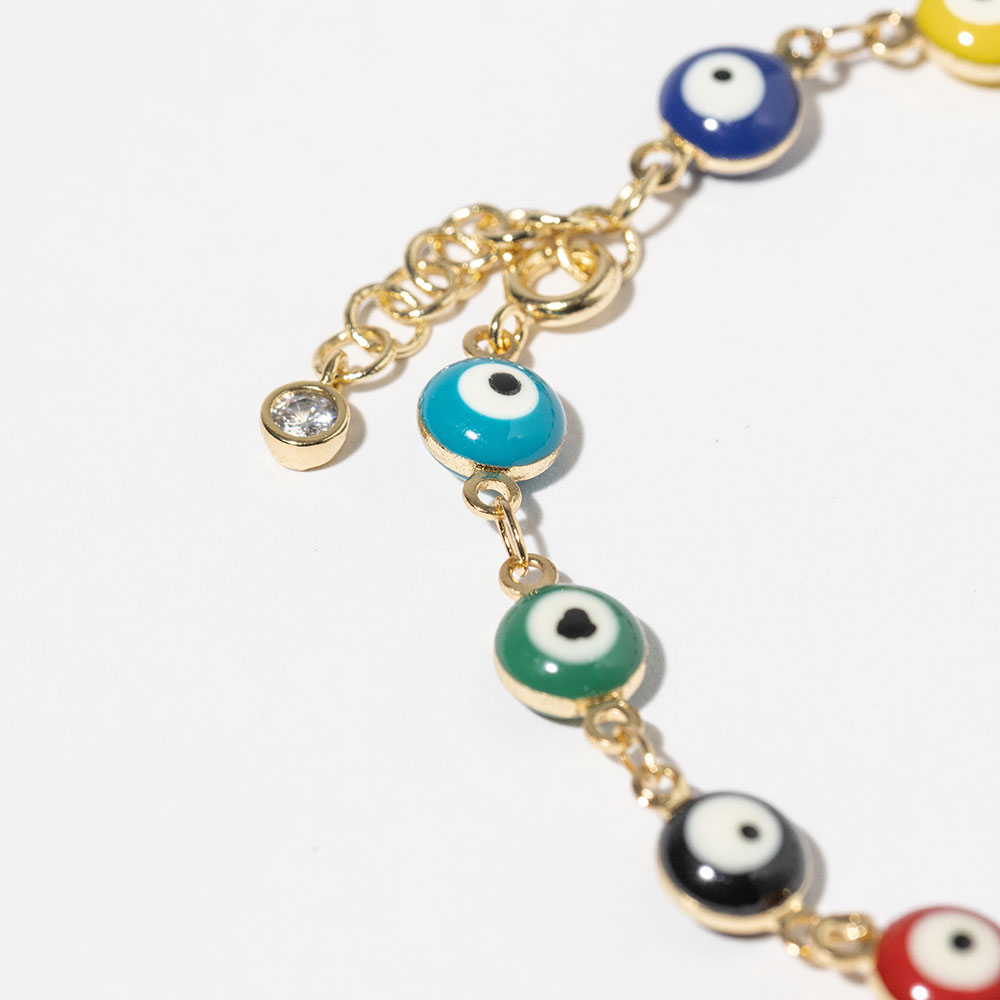 • Playful evil eye link bracelet designed with a series of round charms symbolizing protection and positivity. A chic, lightweight accessory that adds a touch of color and meaning to your look, perfect for layering or wearing solo as a trendy everyday good luck piece.