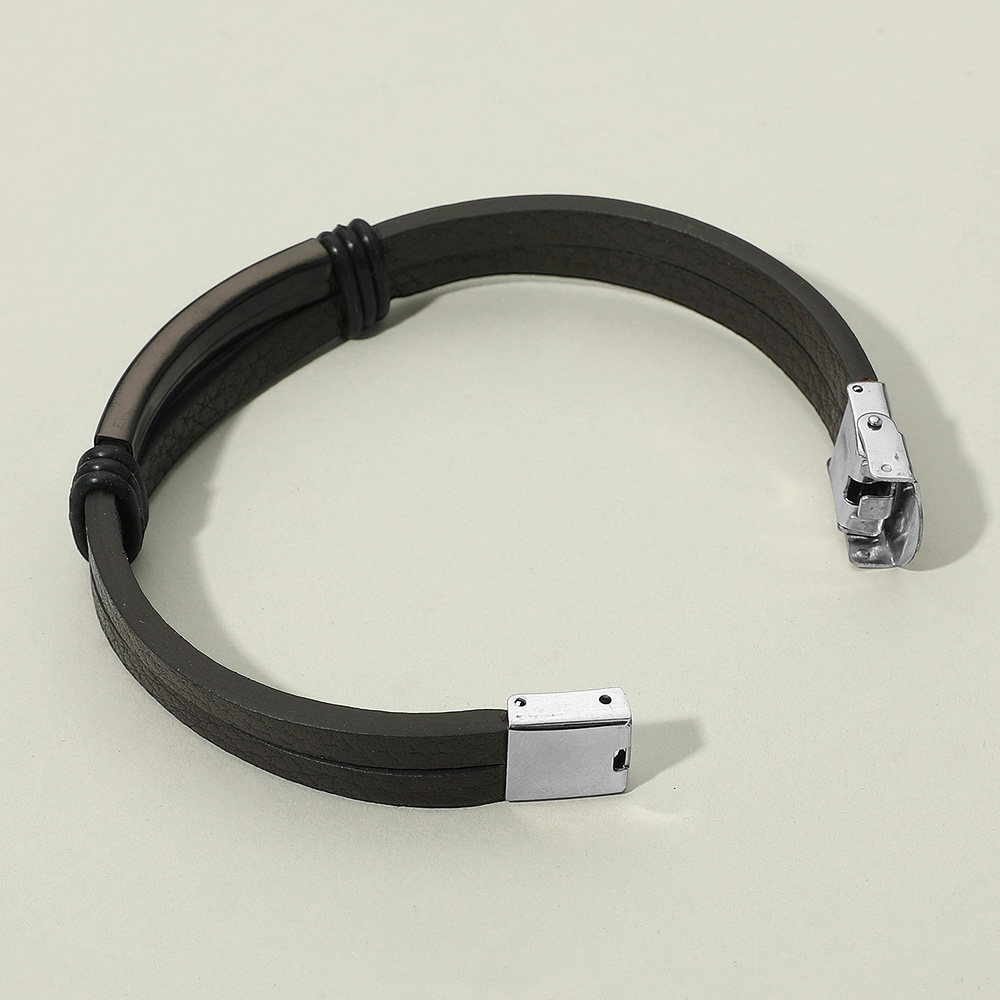 Details • Size : 0.6" H, 8" + 0.5" L • Genuine Leather • Clasp Closure • This sleek leather bracelet features a polished metal plate accent and a secure clasp closure for a refined, modern look. Comfortable and durable, it’s a versatile accessory that complements casual, business, and evening styles effortlessly. • Lead and Nickel Compliant