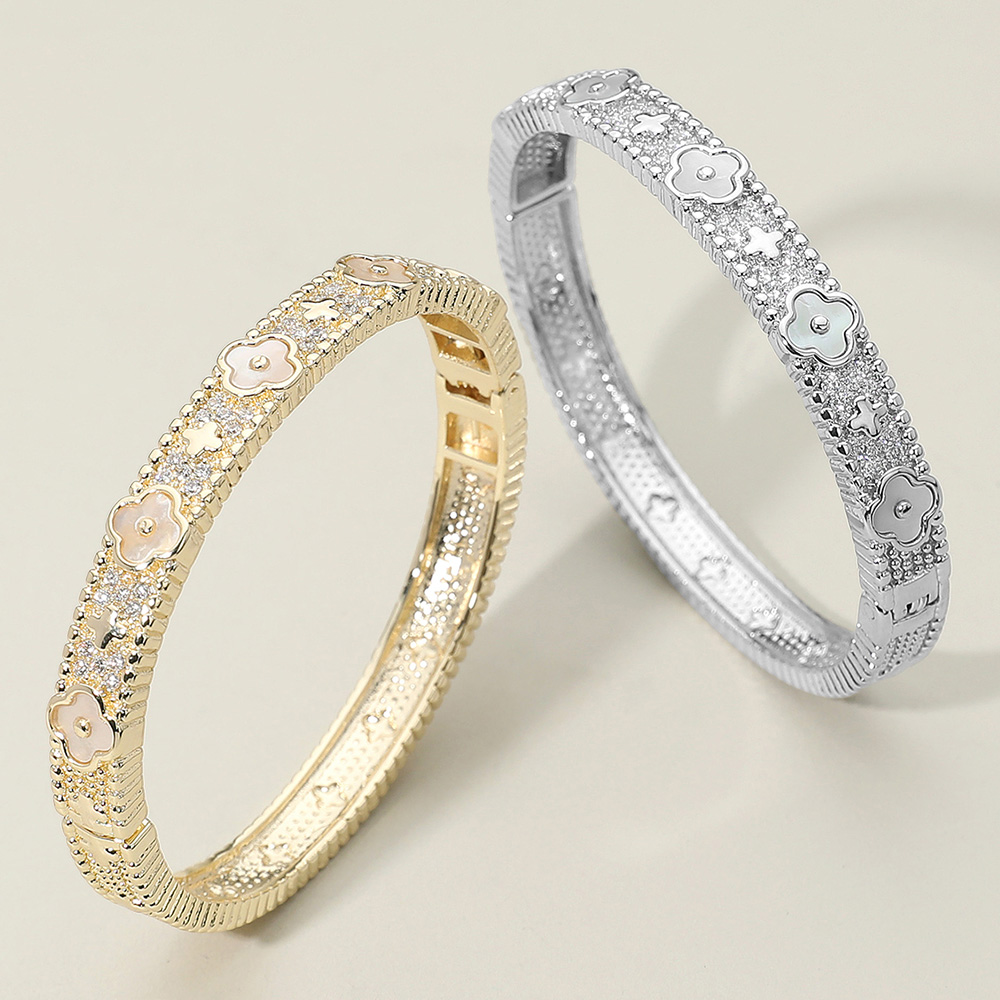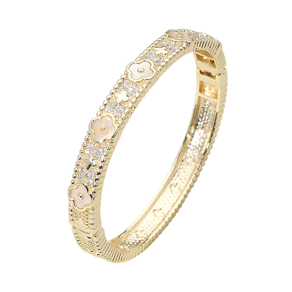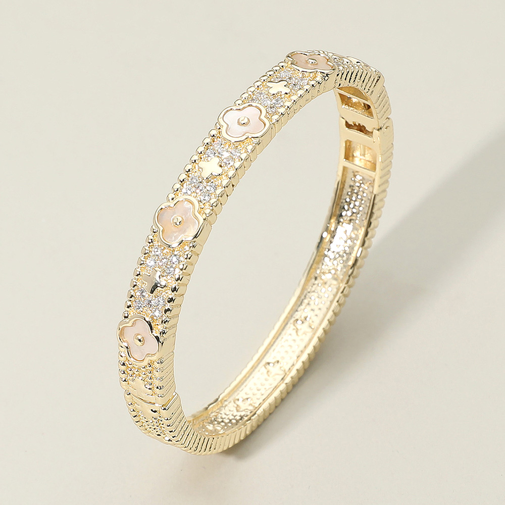 Mother of Pearl Quatrefoil Accent CZ Stone Paved Hinged Bangle Bracelet