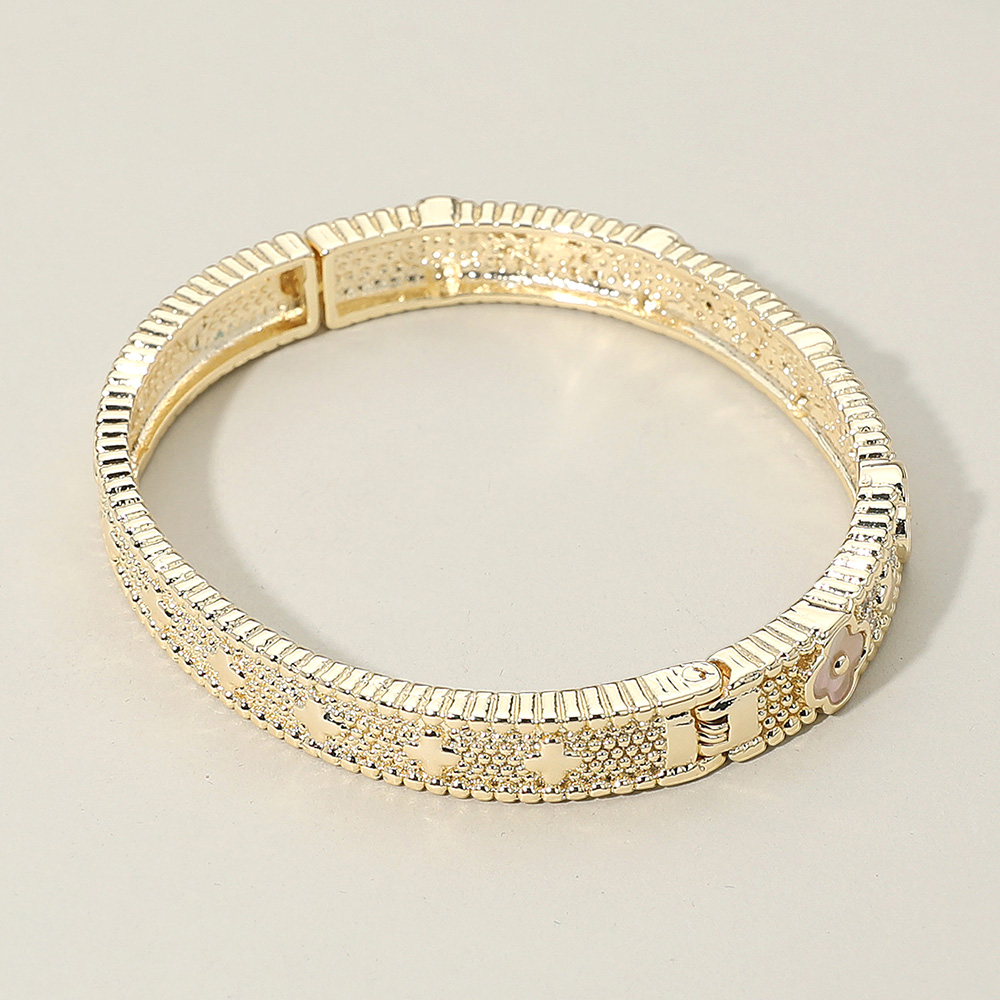 Details • Size : 0.3" H, 2.3" D • Hinged Closure • Elevate your look with this elegant hinged bangle featuring delicate quatrefoil accents and shimmering crystal details. Its refined design offers timeless sophistication, making it perfect for both everyday wear and special occasions where a touch of sparkle is desired. • CZ Cubic Zirconia