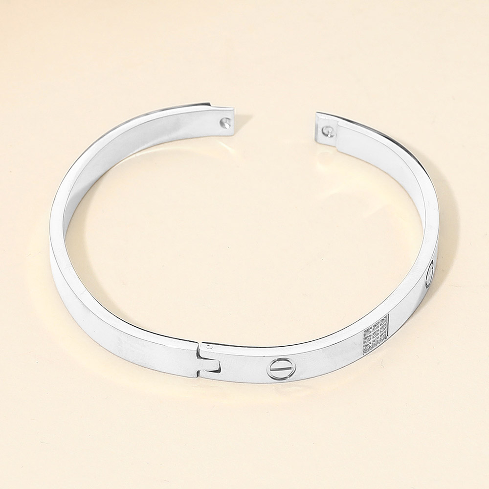 Details • Size : 0.25" H, 2.4" D • Hinged Closure • Water Resistant • Elegant hinged bangle bracelet featuring sleek geometric accents and a polished finish for a timeless, modern appeal. Perfect for both everyday wear and special occasions, this minimalist accessory adds sophistication and understated luxury to any outfit. • Hypoallergenic • Lead and Nickel Compliant