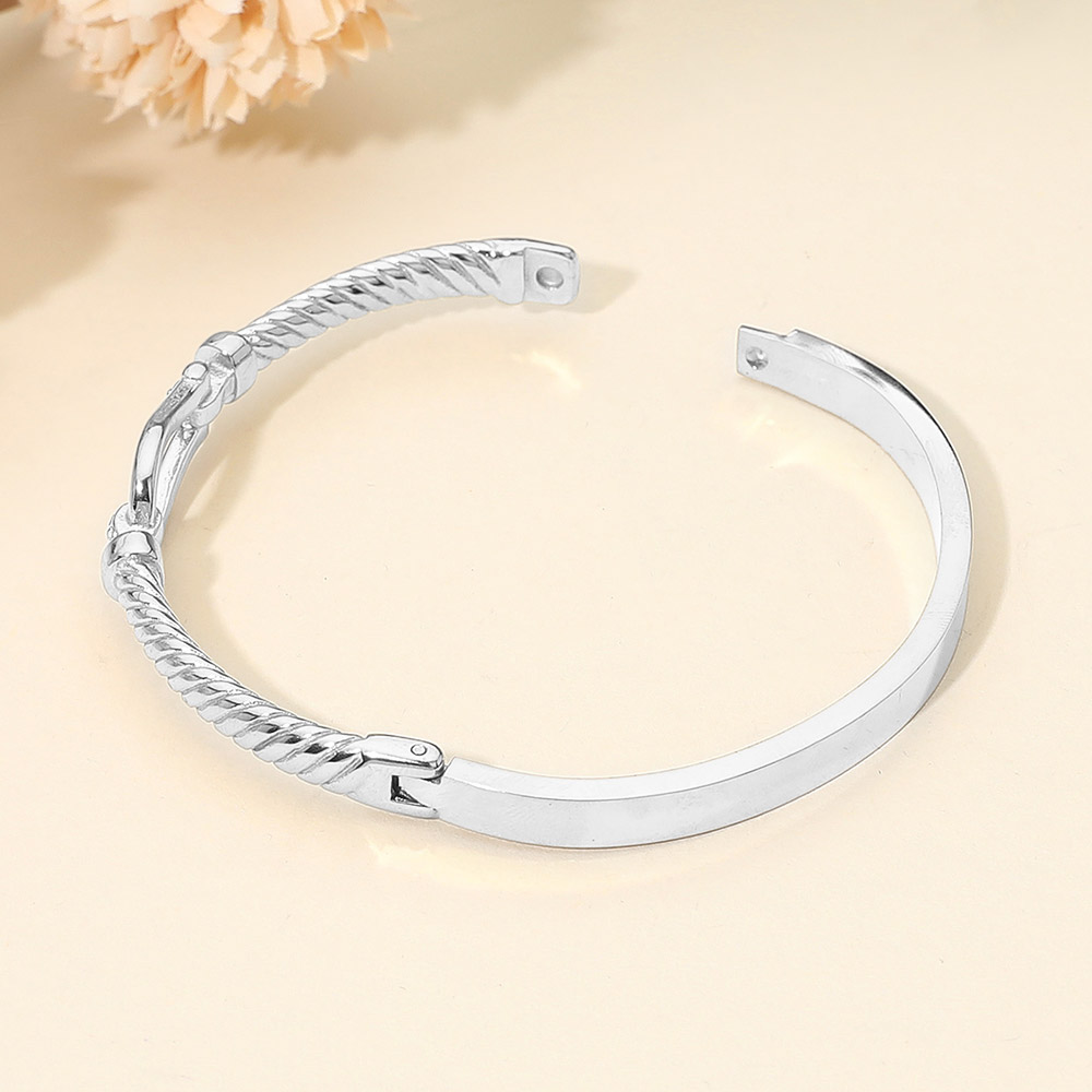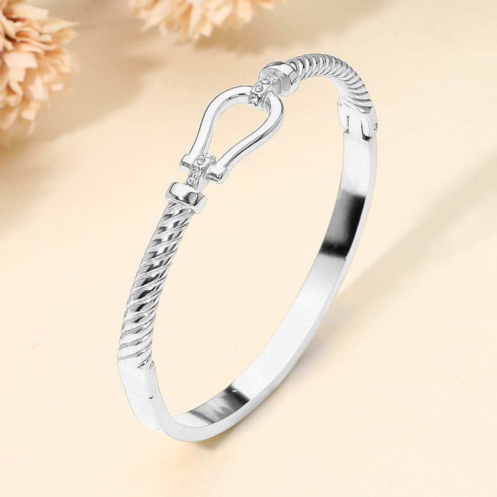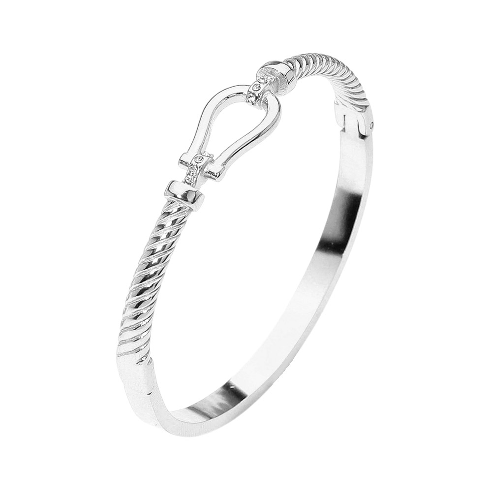 Details • Size : 0.5" H, 2.4" D • Hinged Closure • Water Resistant • Chic textured bangle bracelet featuring an elegant Horsebit buckle-style accent with a polished design. A sophisticated accessory that blends timeless style with modern charm, perfect for dressing up casual looks or adding refinement to formal outfits. • Hypoallergenic • Lead and Nickel Compliant