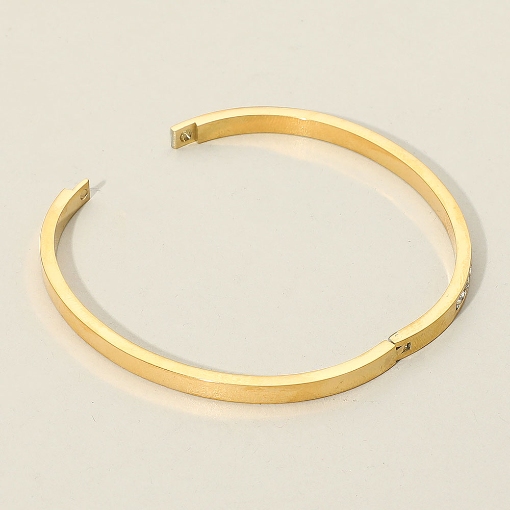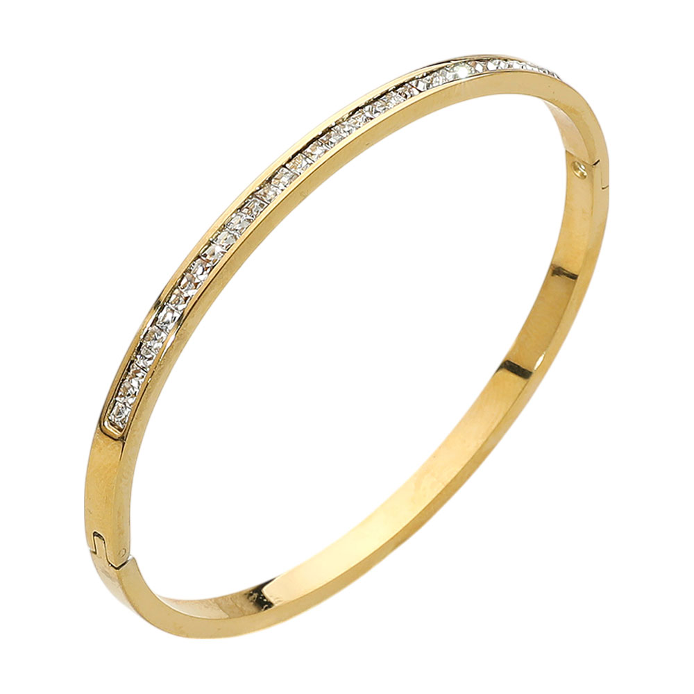 Details • Size : 0.2" H, 2.4" D • Hinged Closure • Water Resistant • Sleek hinged bangle bracelet with a row of sparkling rhinestone accents. Classic and elegant design perfect for stacking or wearing solo to add a refined touch to day or evening looks. • Stainless Steel