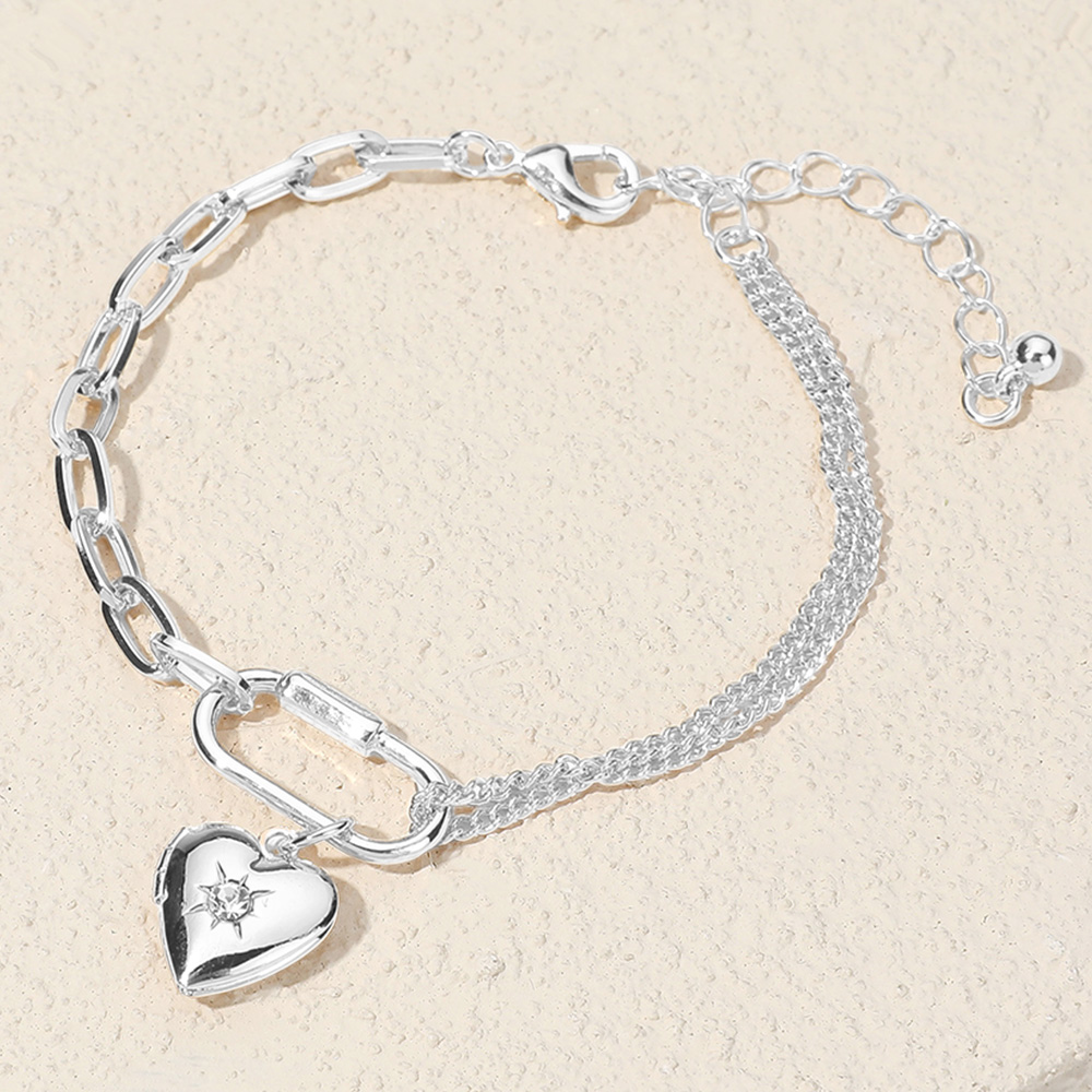 Details • Size : 1" H, 7" + 2.5" L • Lobster Clasp Closure • Elegant bracelet featuring a heart charm with star detail, layered chain strands, and bold link accents. Includes adjustable extender for a secure fit. Perfect for adding a romantic touch to any look.
