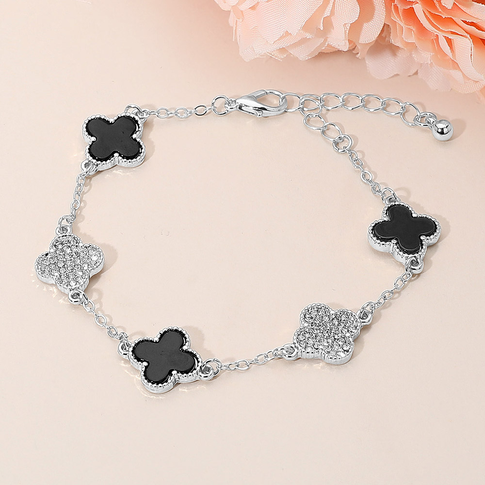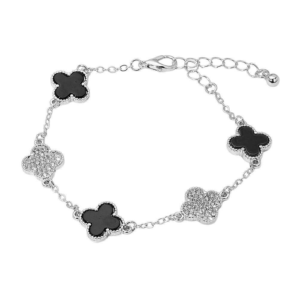 Details • Size : 0.5" H, 7.5" + 1.5" L • Lobster Clasp Closure • Elevate your style with this elegant quatrefoil charm bracelet featuring sparkling crystal accents. A chic quatrefoil design perfect for layering or gifting. Adjustable chain for a comfortable fit and everyday glam. • Lead and Nickel Compliant • Sterling Silver Dipped