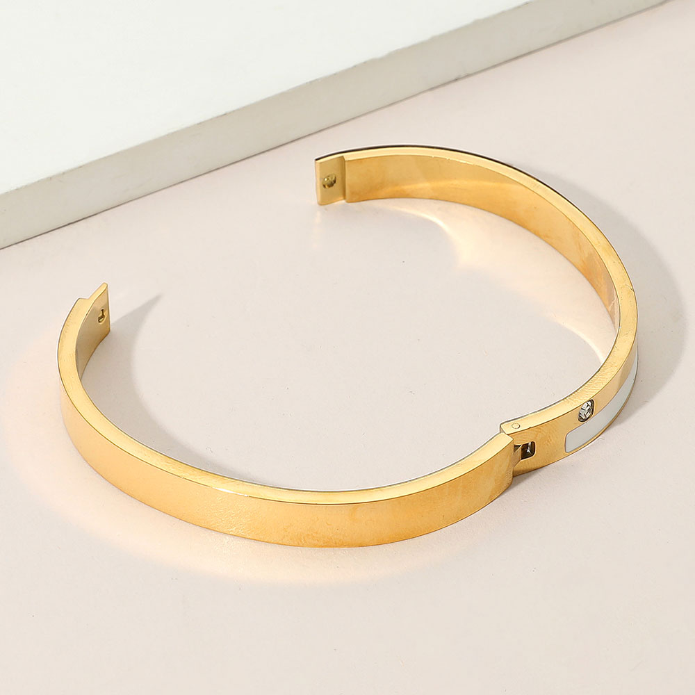 Details • Size : 0.3" H, 2.4" D • Hinged Closure • This sophisticated bangle bracelet features a smooth enamel inlay and shimmering crystal accents. Designed with a secure hinged closure, it adds a refined, modern touch to both casual and formal ensembles. • CZ Cubic Zirconia • Stainless Steel