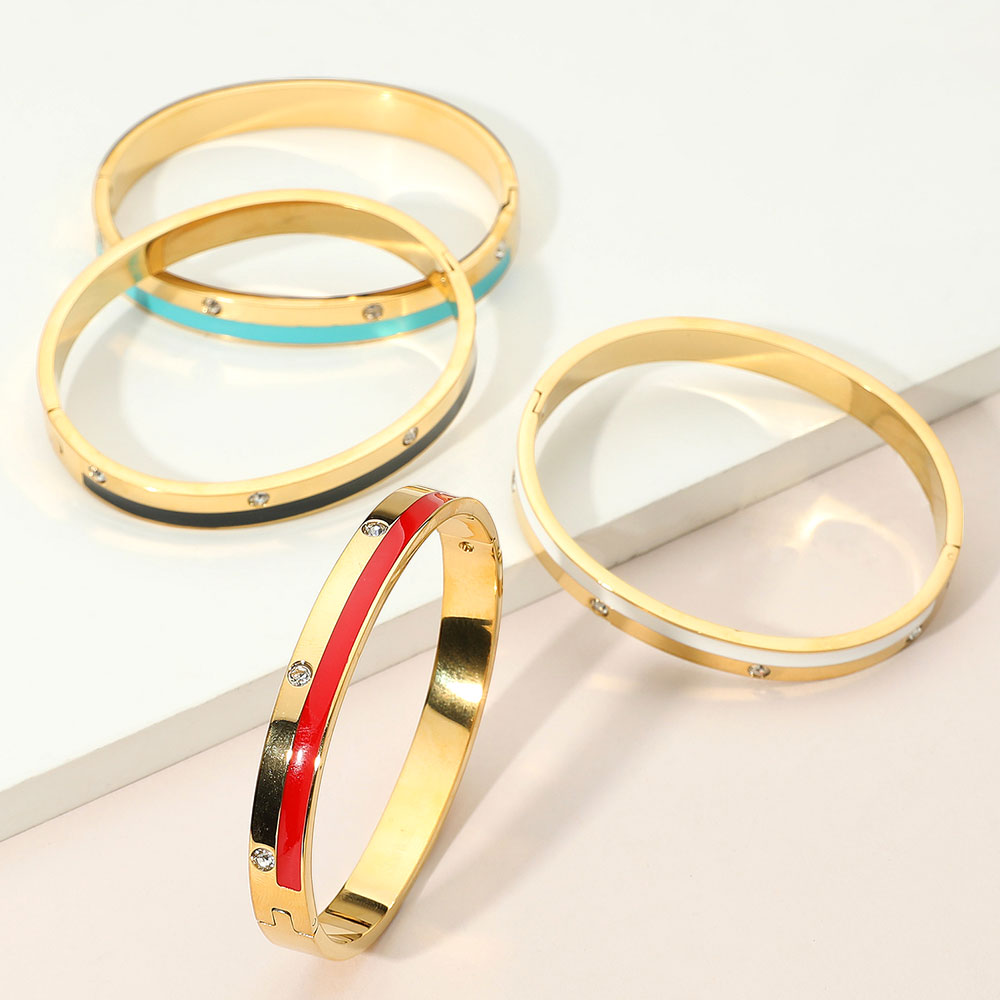 Stainless Steel Enamel Inlay CZ Stone Accents Hinged Bangle Bracelet