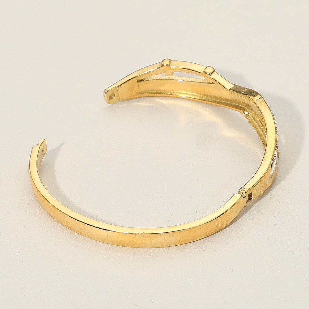 Details • Size : 0.6" H, 2.5" D • Hinged Closure • Modern bangle bracelet featuring geometric detailing and sleek contrasting inlay with a sparkling accent line. Designed with a secure hinged closure, this sophisticated piece adds a refined edge to both everyday looks and evening ensembles. • CZ Cubic Zirconia • Stainless Steel