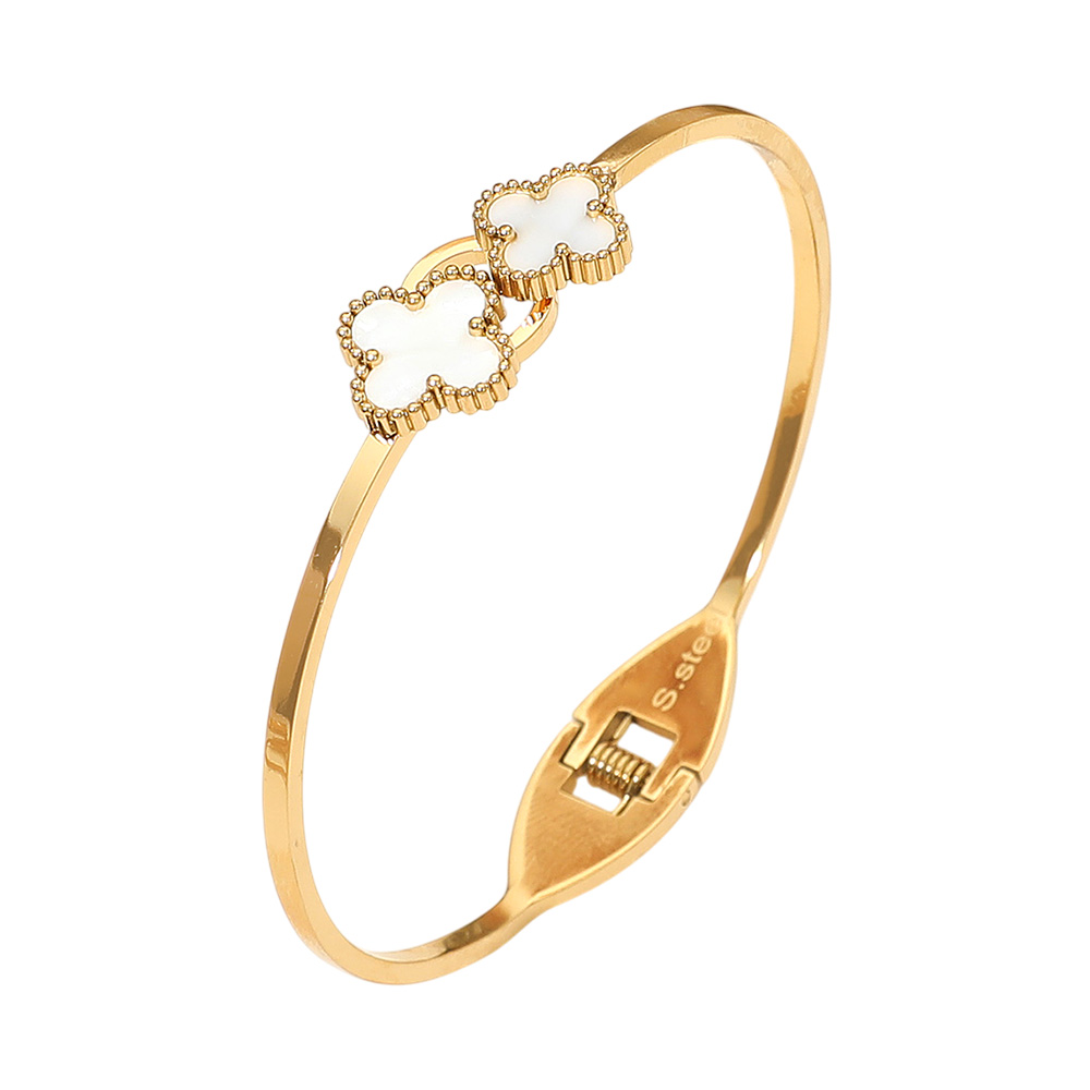 Details • Size : 0.6" H, 2.4" D • Hinged Closure • Bring elegance to your wrist with this quatrefoil charm hinged bangle bracelet. Designed with sleek detailing and a secure clasp, it’s perfect for both everyday wear and special occasions. A timeless accessory that adds refined charm and makes a thoughtful gift choice. • Stainless Steel
