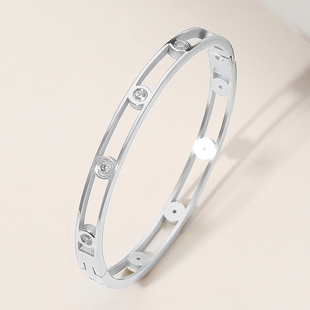 Details • Size : 0.25" H, 2.3" D • Hinged Closure • Elevate your everyday style with this stainless steel sleek open bangle bracelet featuring sparkling crystal accents. Its modern, lightweight design offers effortless elegance, perfect for both casual and formal wear. A timeless accessory that adds a refined touch to any look. • Stainless Steel