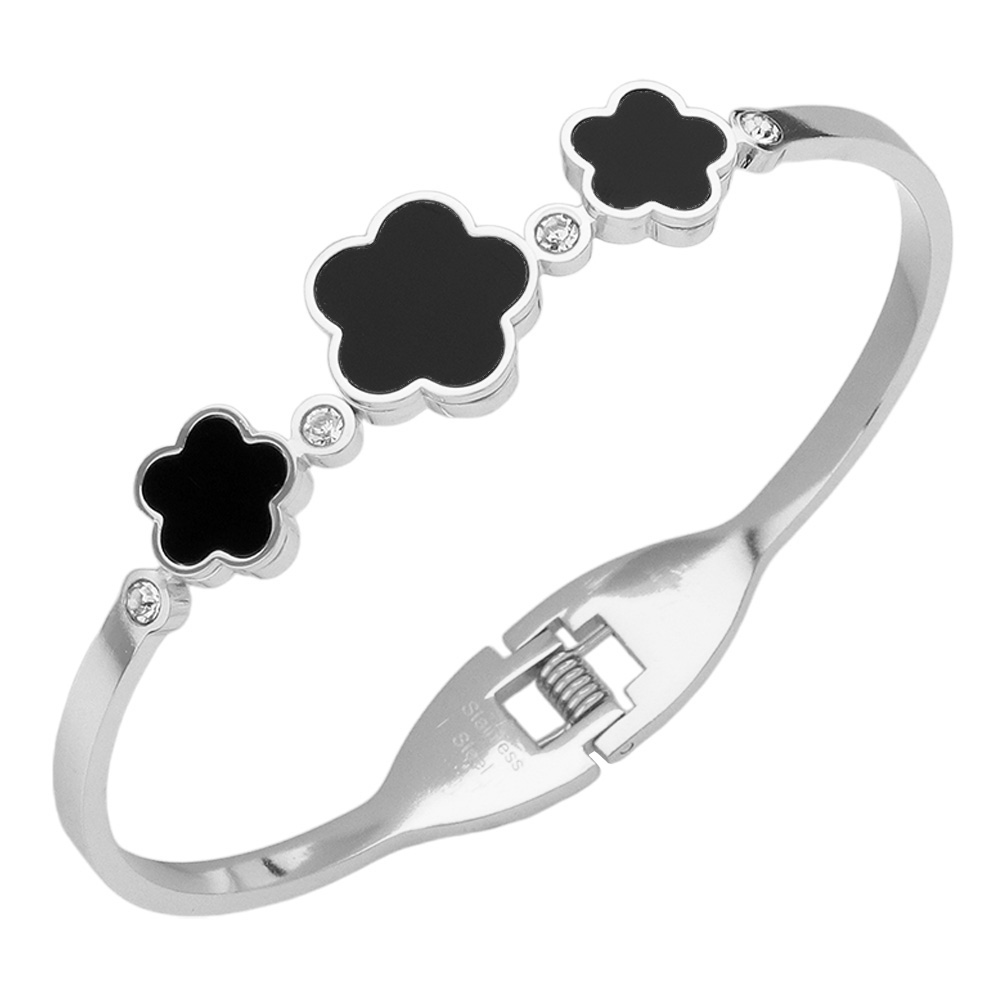 • Elegant bangle bracelet featuring delicate quatrefoil-inspired floral charms accented with sparkling details. A versatile accessory that blends sophistication and style, perfect for everyday wear, evening outings, or gifting someone special.