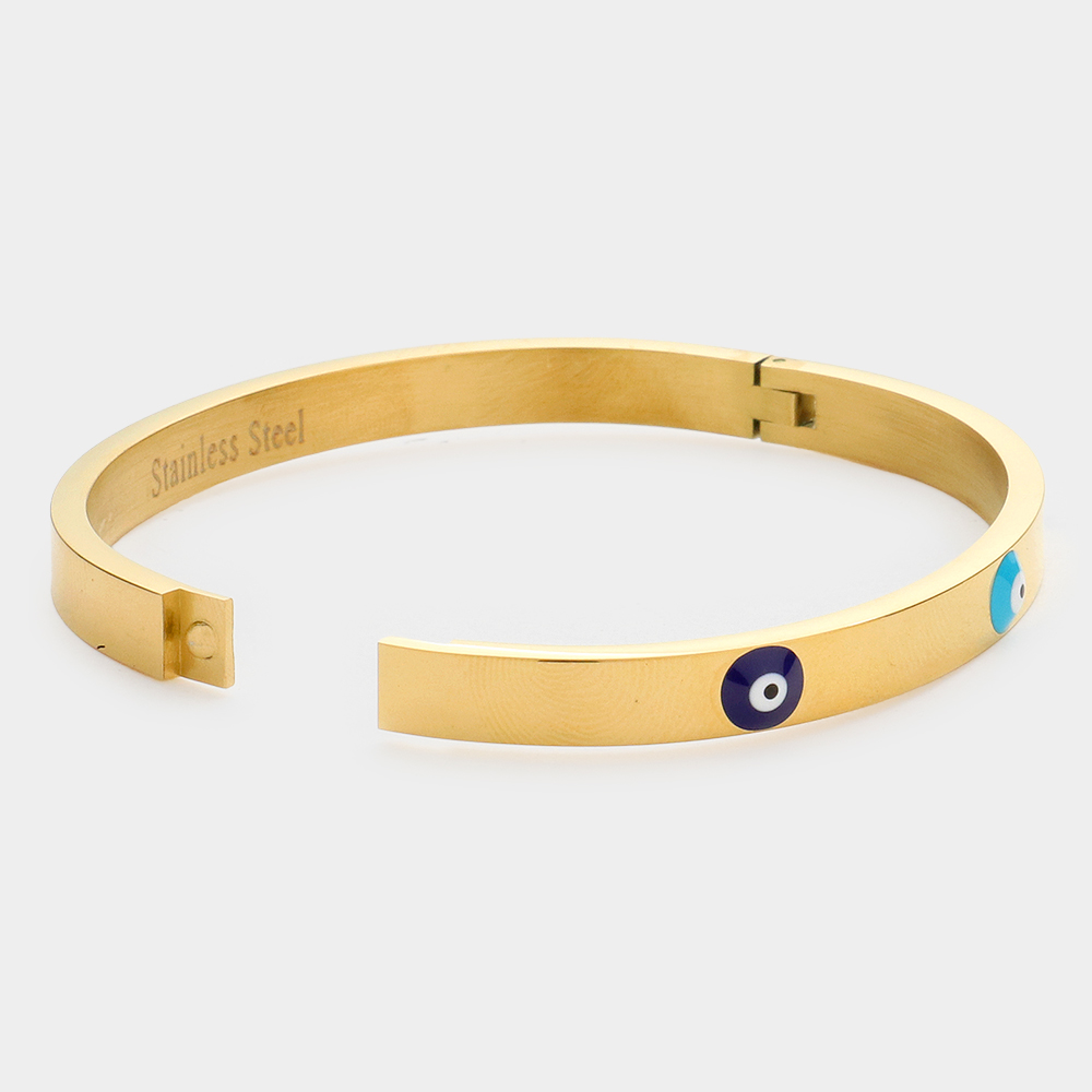 • Embrace modern style with this sleek bangle adorned with symbolic evil eye charms for protection and good fortune. Perfect for everyday wear or layering, this bracelet blends elegance and meaning, making it a thoughtful gift or a chic addition to your jewelry collection.