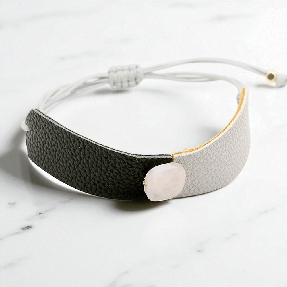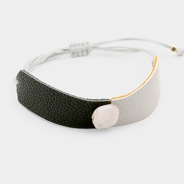 Two Tone Leather Square Bead Accented Adjustable Cinch Pull Tie Bracelet