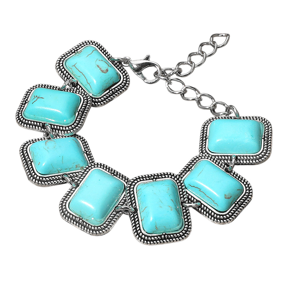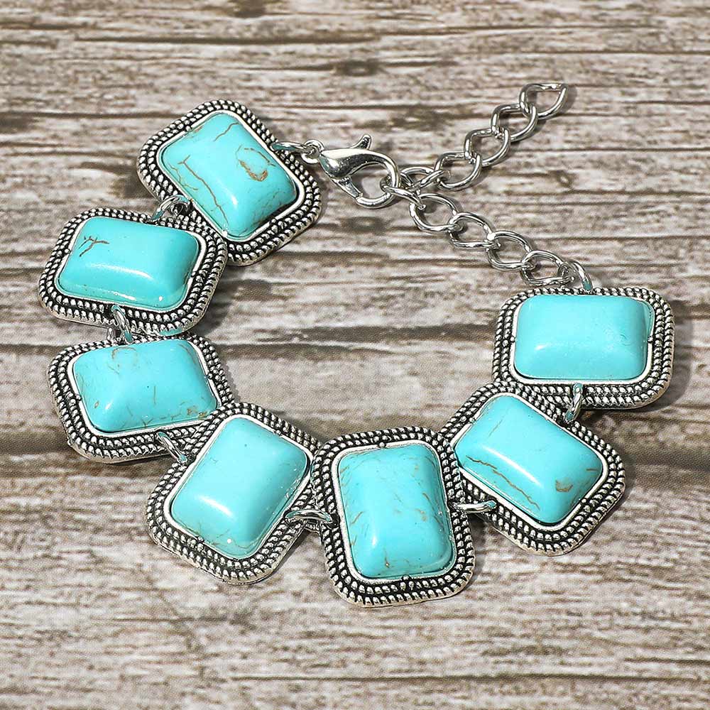 Details • Size : 0.75" H, 6" + 2" L • Lobster Clasp Closure • Showcase timeless style with this vintage square stone bracelet, designed with ornate textured frames and an adjustable chain for the perfect fit. A chic and versatile accessory that complements both casual and dressy outfits with effortless elegance. • Lead and Nickel Compliant