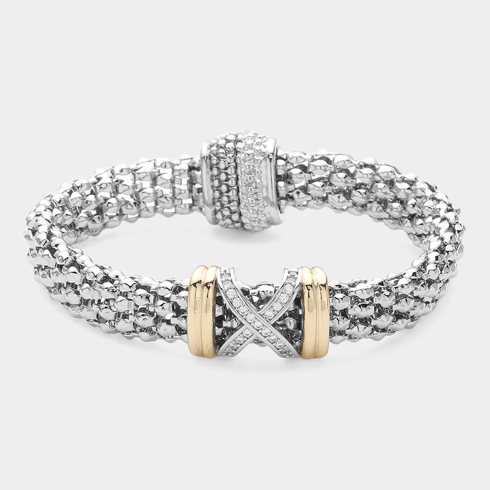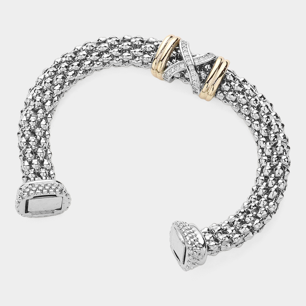 14K Gold Plated CZ Stone Paved Crisscross Pointed Two Tone Magnetic Bracelet