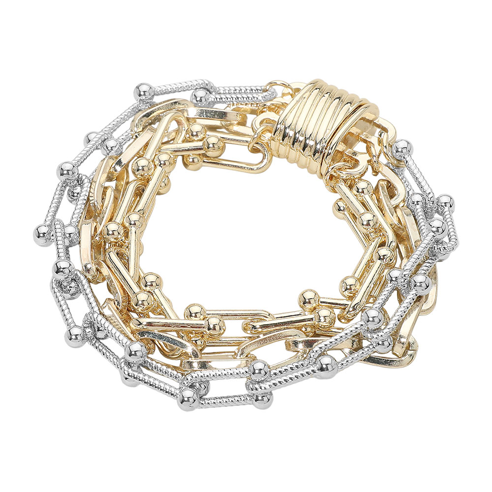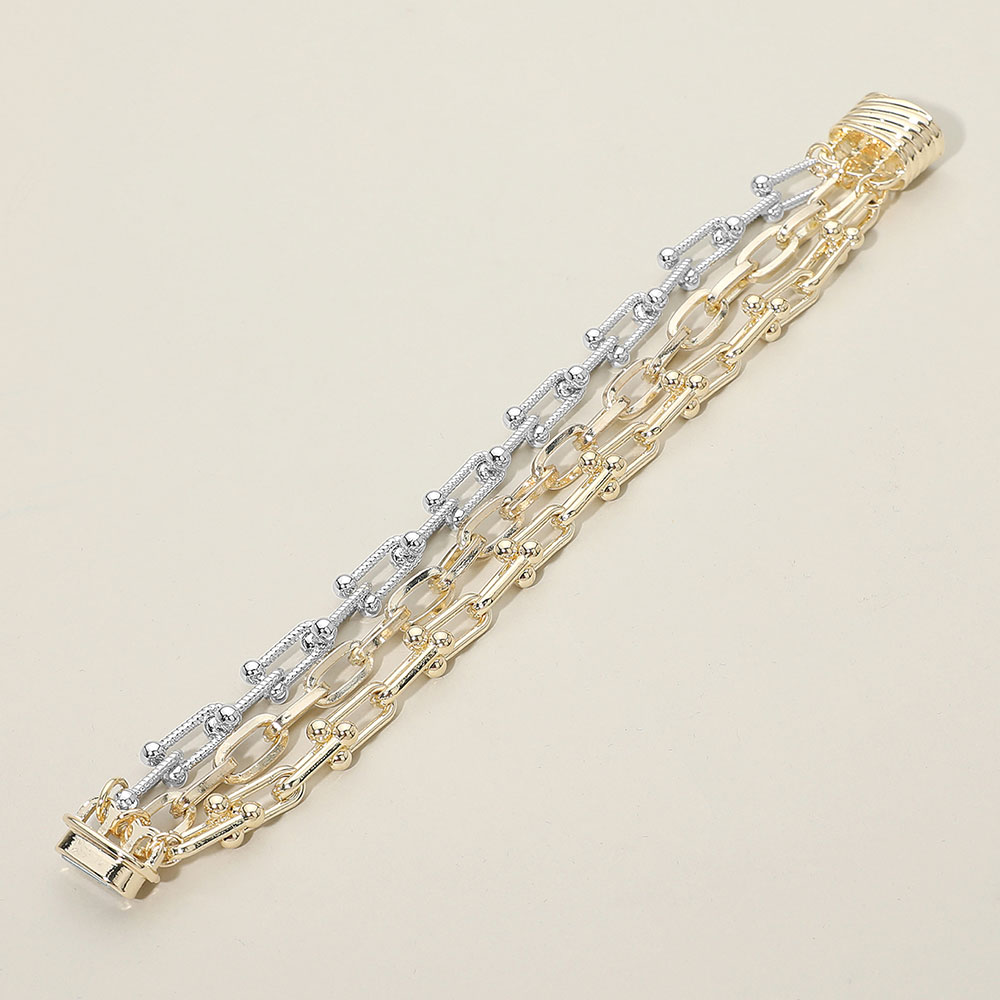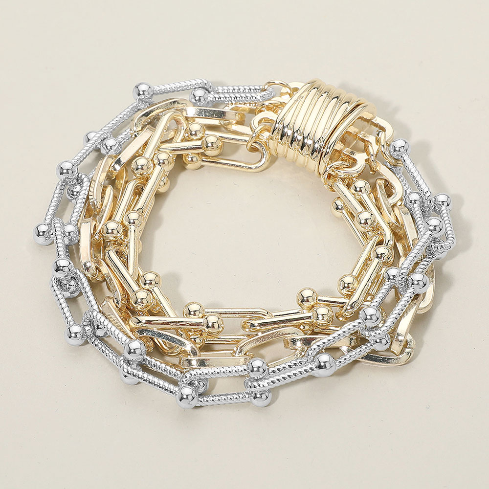 Details • Size : 0.75" H, 8.25" L • Magnetic Closure • Bold statement bracelet featuring layered link textures with bead accents and a secure magnetic closure. Designed for easy wear and standout styling, this versatile bracelet delivers dimension, movement, and modern appeal, making it ideal for everyday outfits or elevated looks. • Gold Dipped