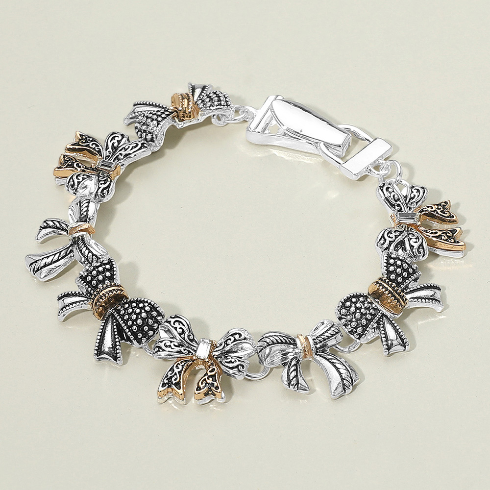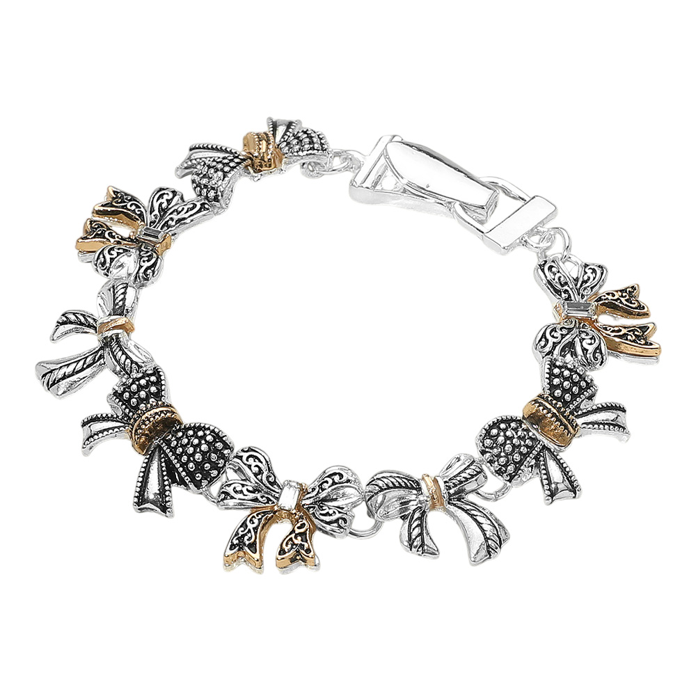 Details • Size : 0.7" H, 7" + 1" L • Magnetic Closure • Adorn your wrist with timeless elegance through this vintage bow charm bracelet, featuring intricate antique detailing and dual-tone accents. A graceful and feminine accessory that blends charm with sophistication, ideal for everyday wear or thoughtful gifting. • Lead and Nickel Compliant