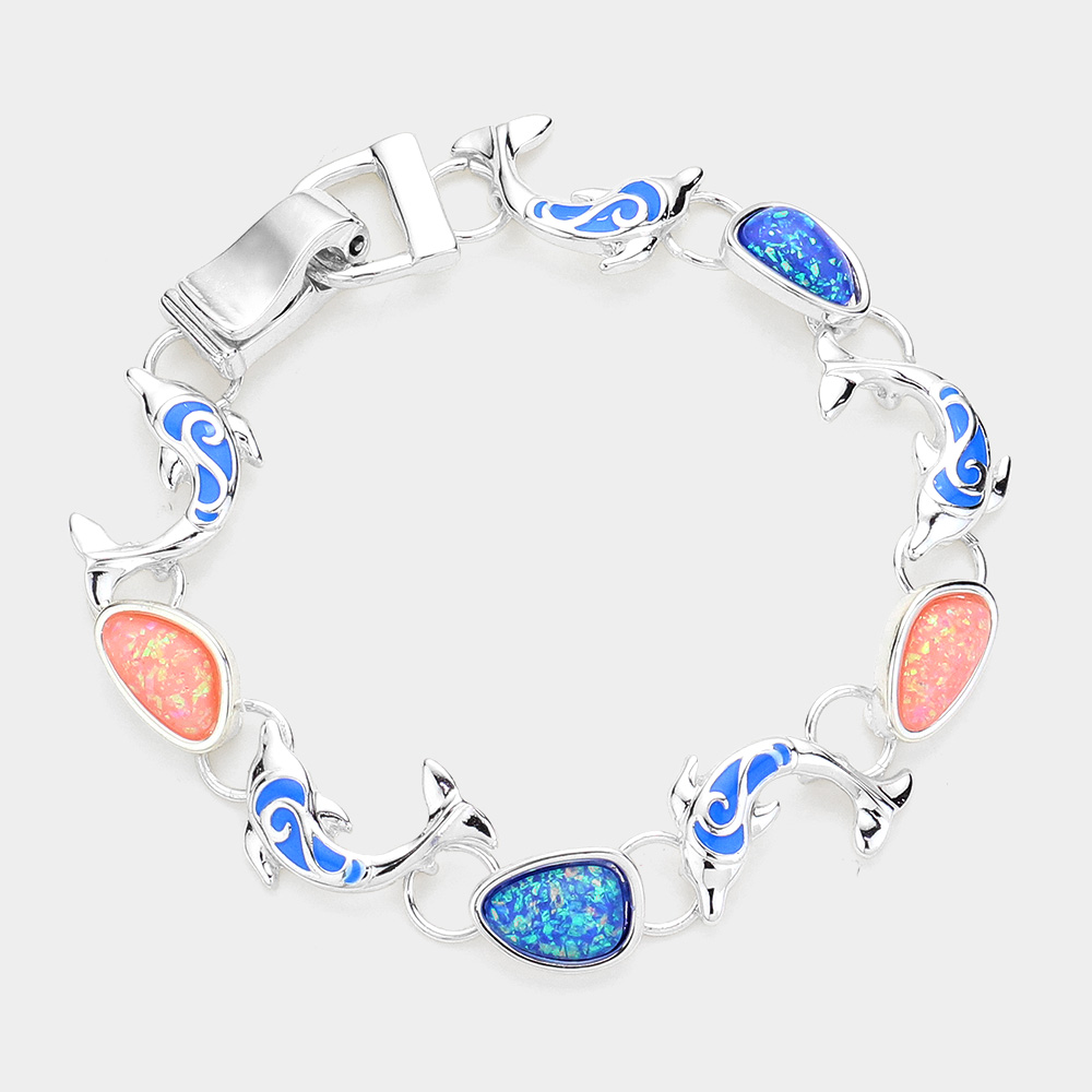 Stainless Steel Ball Stone Paved Fish Charm Beaded Stretch Bracelet