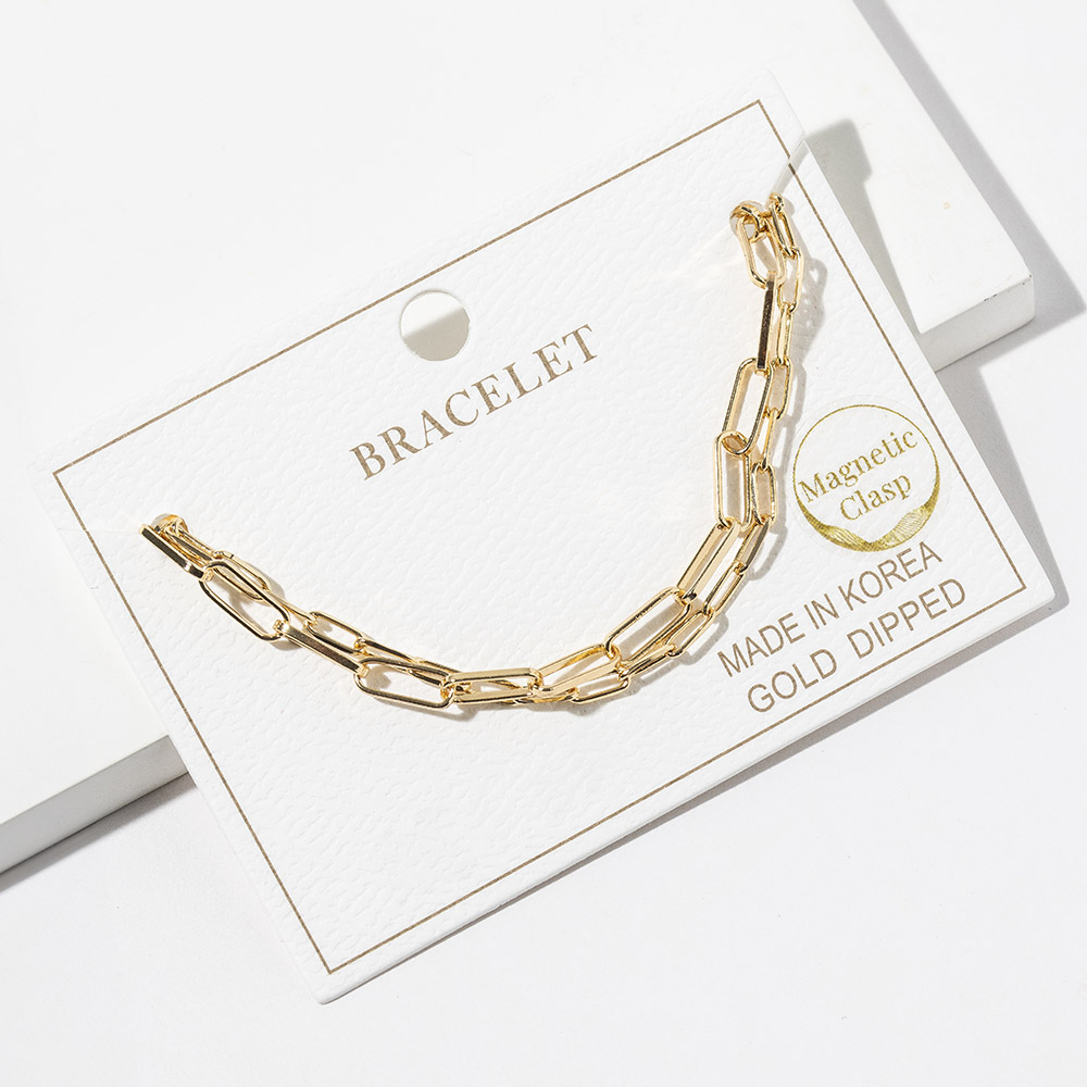 Details • Size : 0.3" H, 7" + 1" L • Magnetic Clasp Closure • Elevate your everyday look with this modern paperclip link bracelet featuring a secure magnetic clasp that makes it easy to put on and remove. Designed for effortless style, its sleek linked silhouette pairs perfectly with casual outfits or layered accessories for a chic and polished finish. • Gold Dipped • Lead and Nickel Compliant • Made In Korea