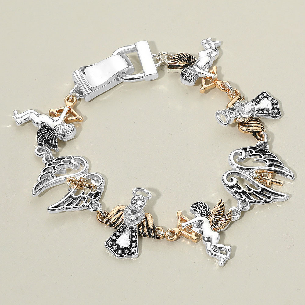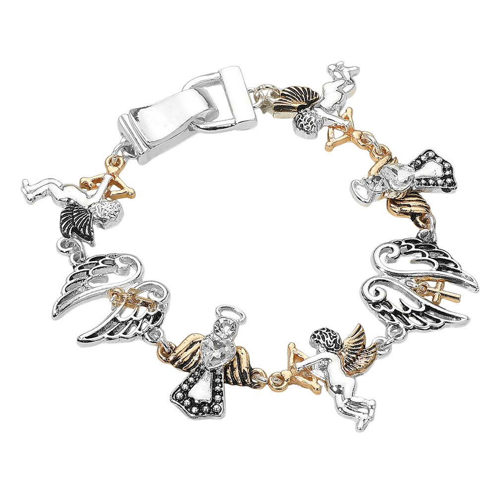 Details • Size : 0.8" H, 8" L • Magnetic Closure • This angel and wing charm bracelet features beautifully detailed celestial figures, combining elegance with symbolic meaning. Each charm adds a touch of divine inspiration, making this accessory a graceful statement piece perfect for both everyday wear and special occasions. • Lead and Nickel Compliant