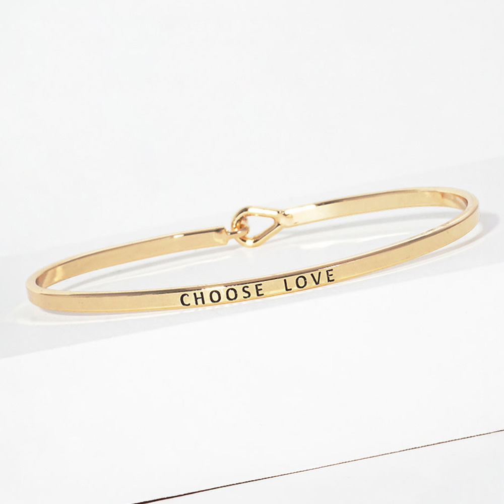 Details • Size : 0.2" H, 2.5" D • Hook Closure • Wear a daily reminder of kindness with this elegant bracelet engraved with "CHOOSE LOVE." Its minimal, timeless design and secure closure make it ideal for everyday wear or as a meaningful gift. A stylish expression of compassion and inner strength. • Lead and Nickel Compliant • Brass