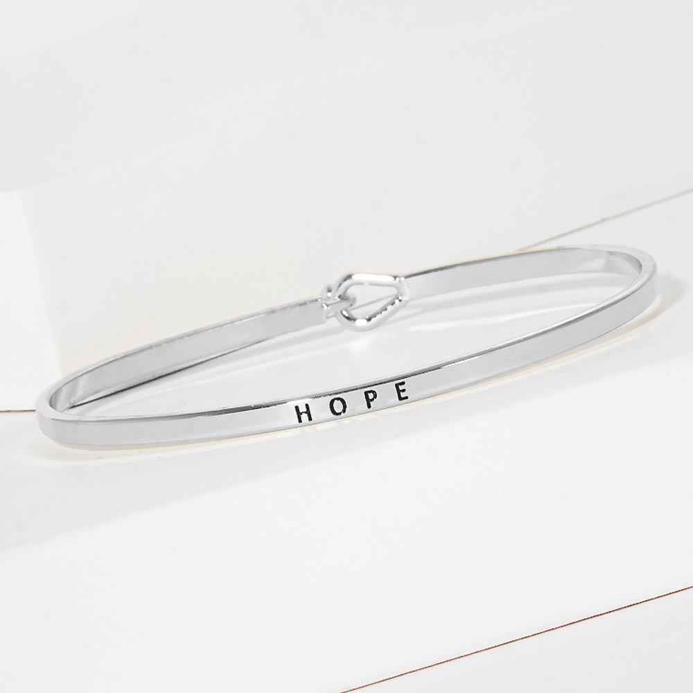 • This delicate bangle bracelet features a slender band engraved with the uplifting word “Hope.” Finished with a heart-shaped hook clasp, it’s a timeless accessory that serves as a daily reminder of resilience and optimism. Perfect for gifting or wearing with meaningful intent.