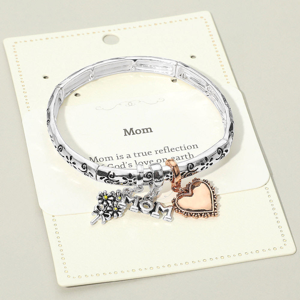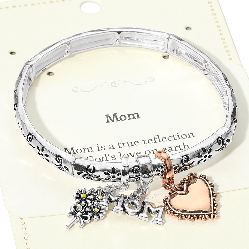 Details • Size : 0.25" H • Charm Size : 0.8" L • Stretchable • Celebrate the love of motherhood with this Mom charm bracelet featuring a floral bouquet, engraved Mom charm, and a heartfelt heart pendant. A meaningful keepsake gift that honors the special bond between mother and child. • Lead and Nickel Compliant