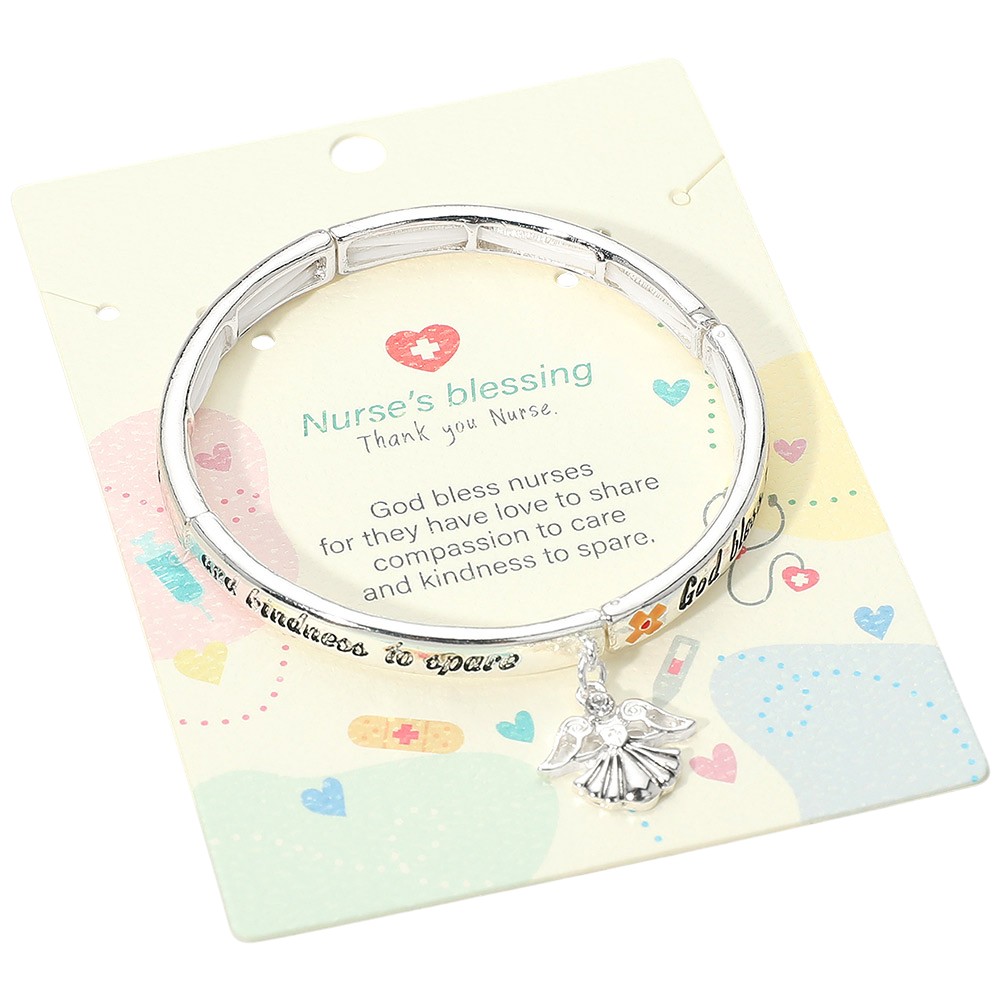 • Nurse’s Blessing bracelet featuring engraved inspirational message and angel charm, a meaningful accessory designed to honor compassion and dedication. A heartfelt appreciation gift perfect for celebrating nurses and expressing gratitude for their care and kindness.