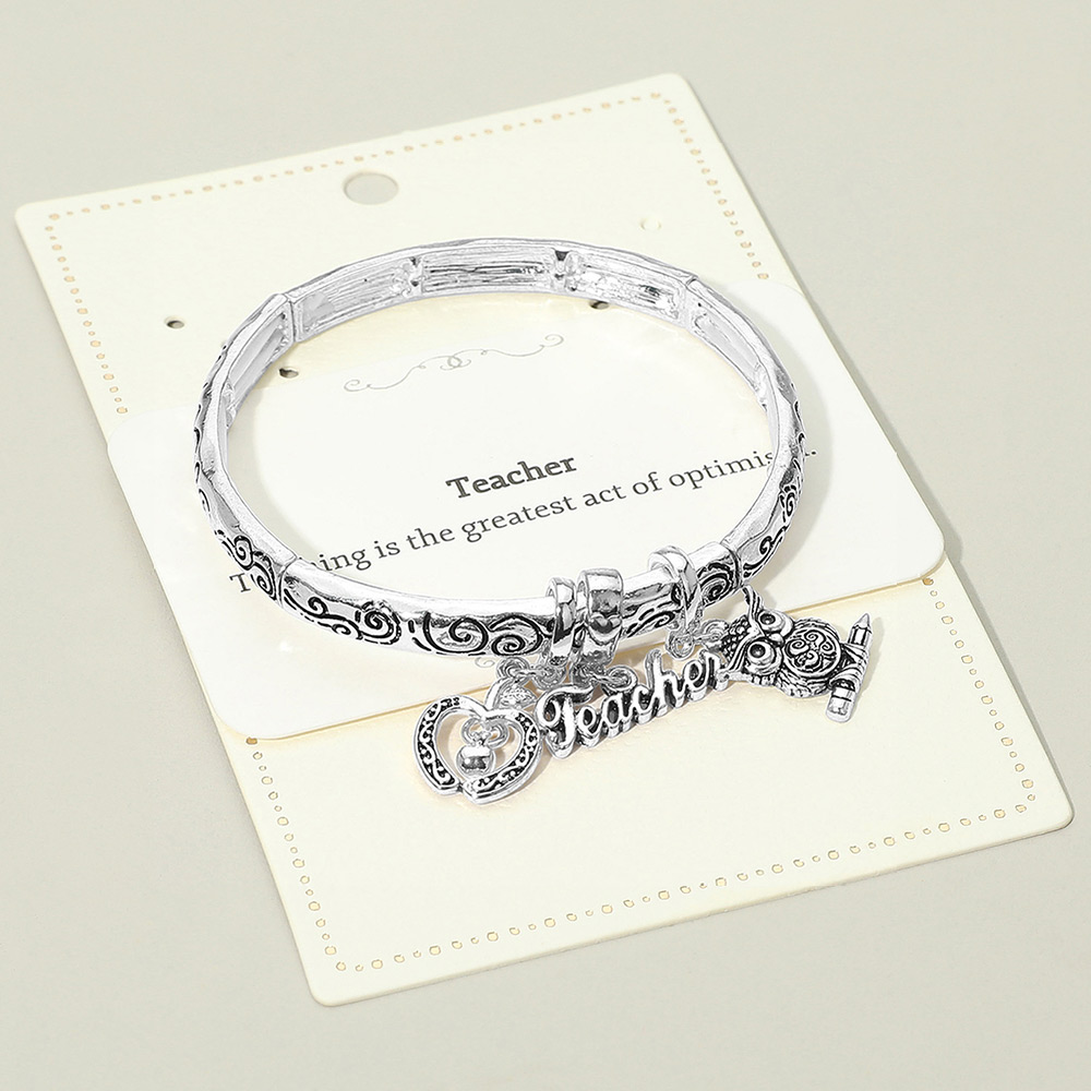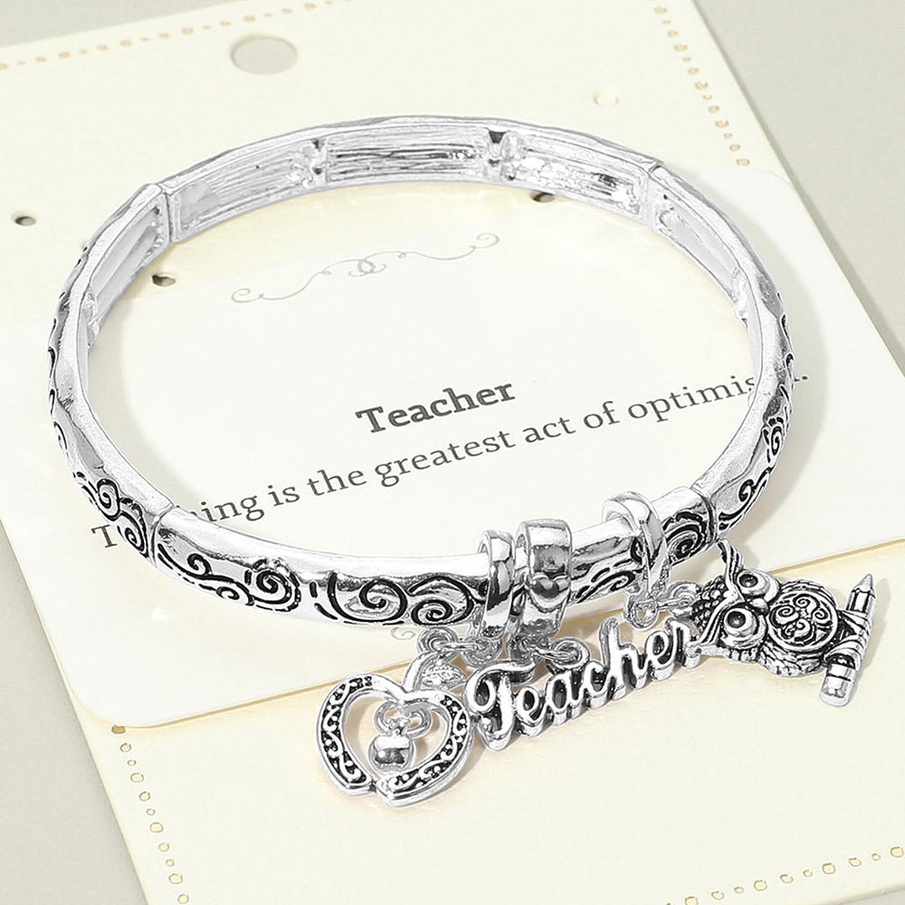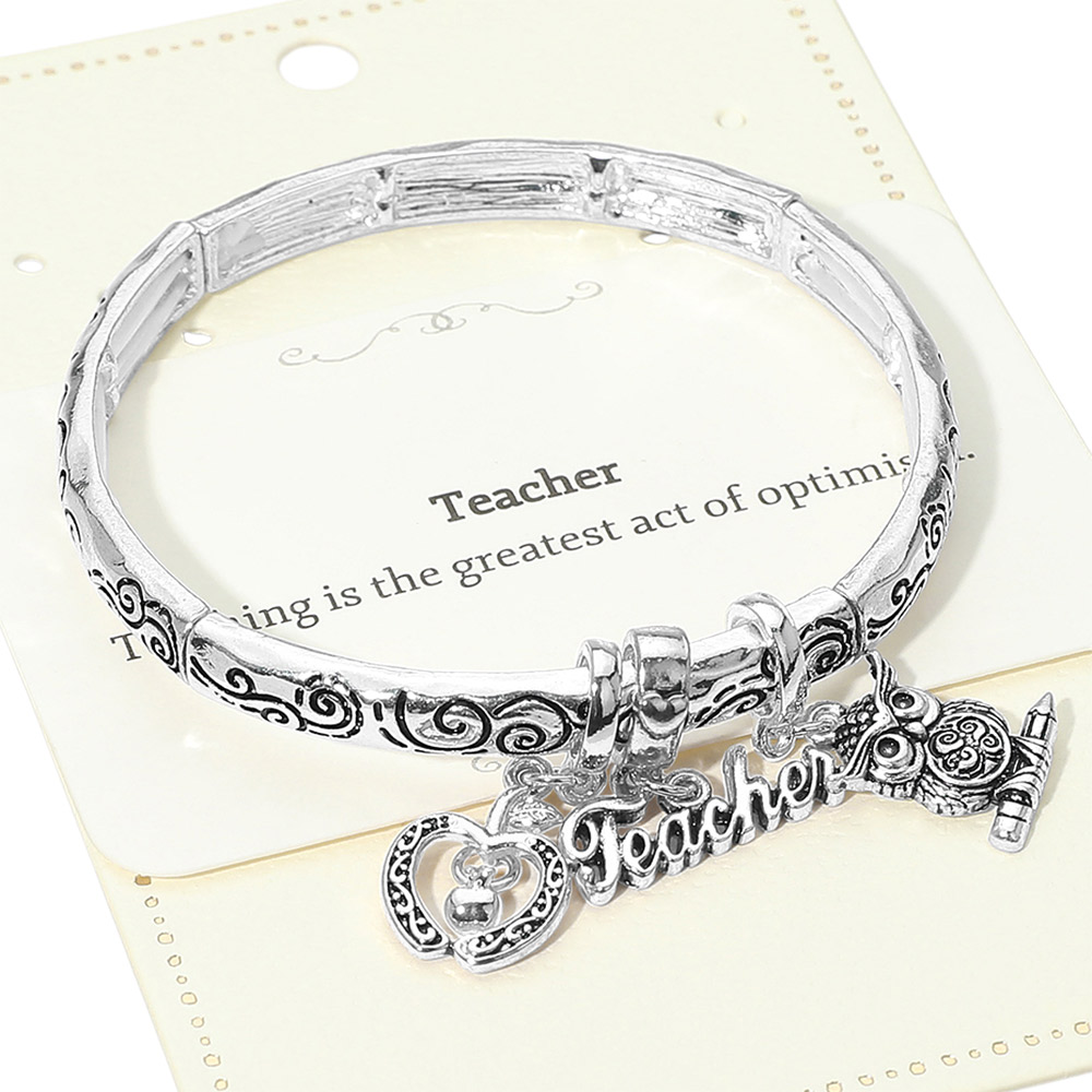 • Honor educators with this Teacher charm bracelet featuring a heartfelt inscription, intricate owl charm, and decorative heart pendant. A meaningful appreciation gift that celebrates teaching as a lasting act of inspiration.