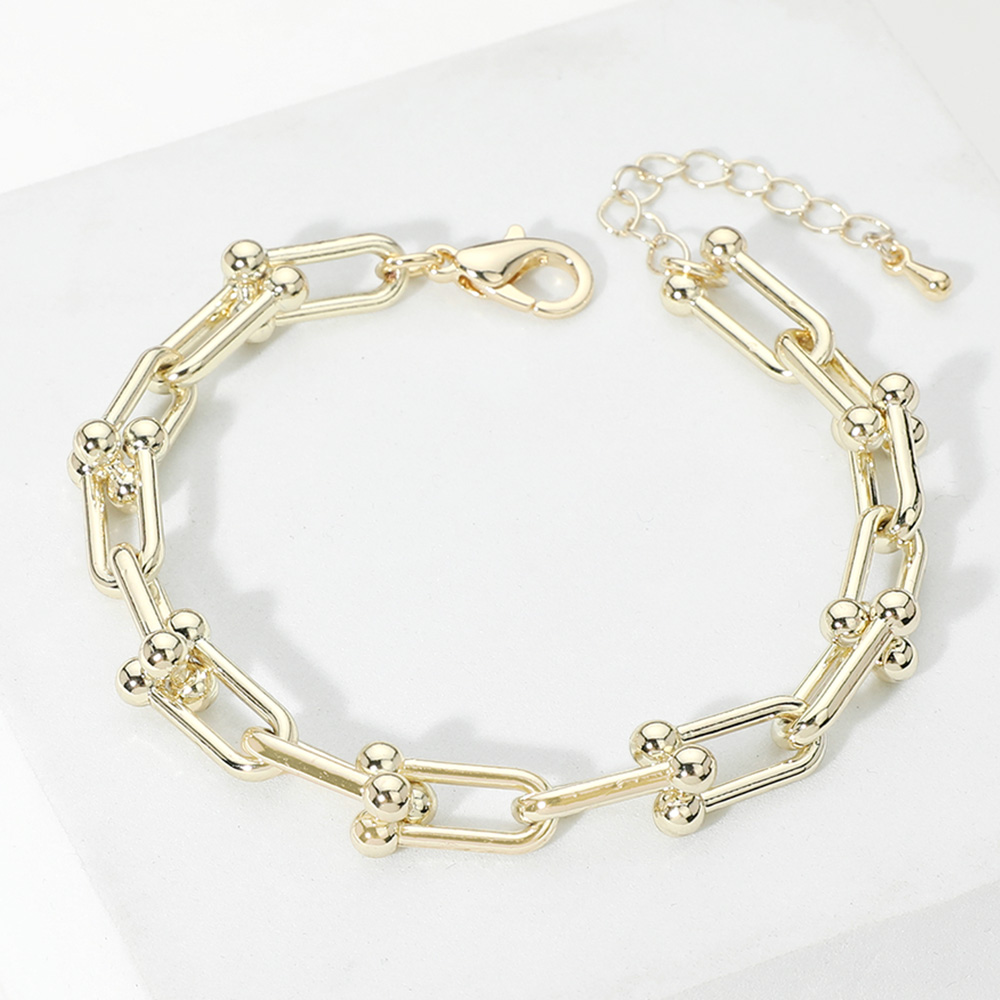 Details • Size : 0.3" H, 7.5" + 2" L • Lobster Clasp Closure • Stylish link bracelet featuring elongated chain links accented with polished bead details for a modern, elevated look. Adjustable design ensures a comfortable fit, making it perfect for everyday wear or layering with other favorites. A chic accessory for any style. • Gold Dipped
