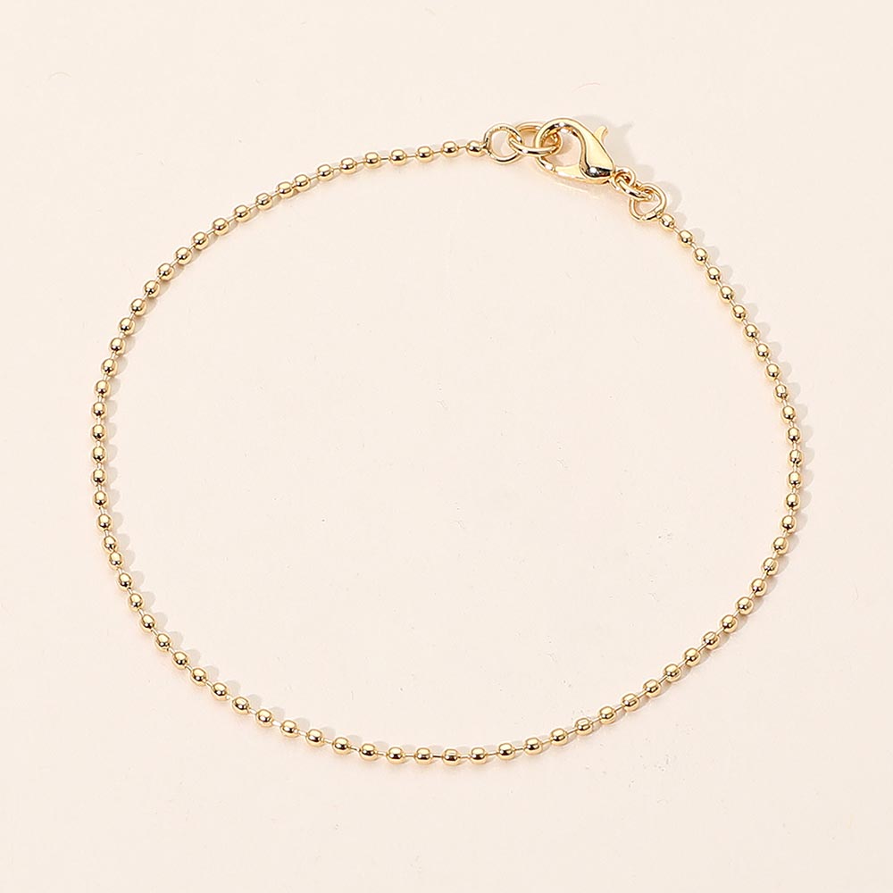 Details • Size : 0.1" H (1mm), 7.5" L • Lobster Clasp Closure • Elegant beaded chain bracelet featuring polished round links for a refined, minimalist appeal. Its delicate design complements any outfit, perfect for layering or solo wear, adding a subtle shine and timeless sophistication to your jewelry collection. • Lead and Nickel Compliant • Gold Filled • Made In Brazil