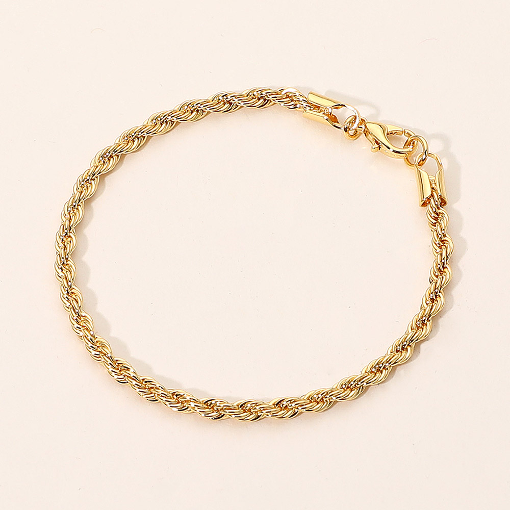 Details • Size : 0.1" H (3mm), 6.5" L • Lobster Clasp Closure • Refined rope chain bracelet showcasing a beautifully twisted pattern for a timeless look. Its intricate braided design adds sophistication and shine, perfect for layering or wearing solo. A chic, minimal accessory that elevates everyday or special occasion styles. • Lead and Nickel Compliant • Gold Filled • Made In Brazil