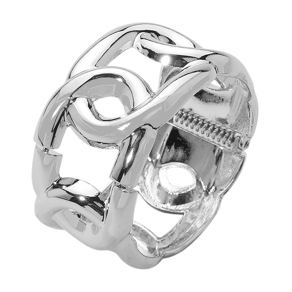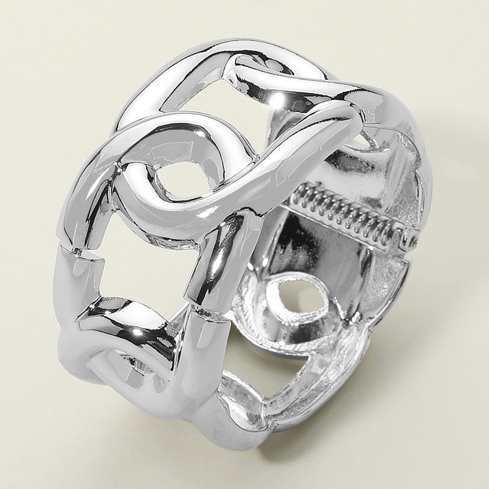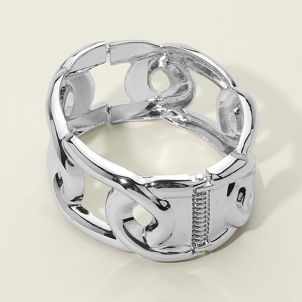 Details • Size : 1.25" H, 2.4" D • Hinged Closure • Elevate your style with this bold hinged bangle bracelet featuring a sculptural chain link design. The wide silhouette and polished finish create a modern, statement-making look that pairs effortlessly with both daywear and evening ensembles. • Lead and Nickel Compliant