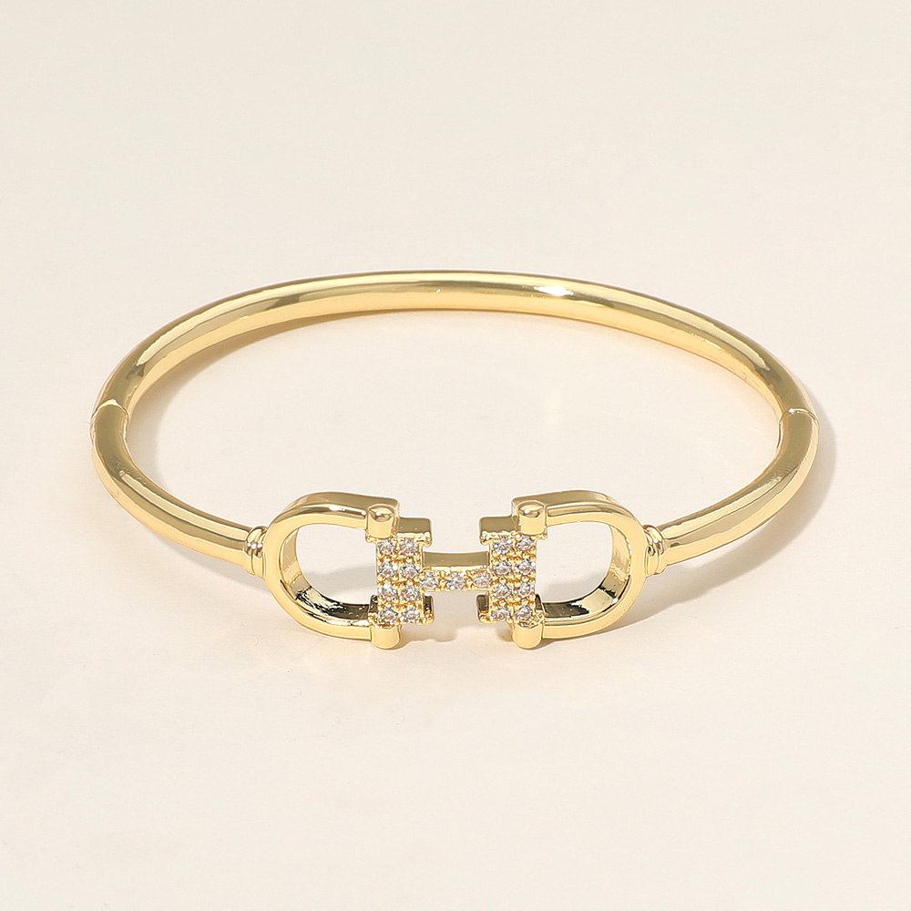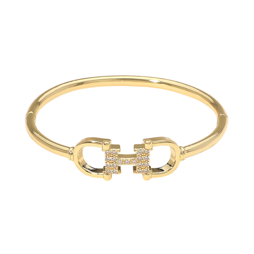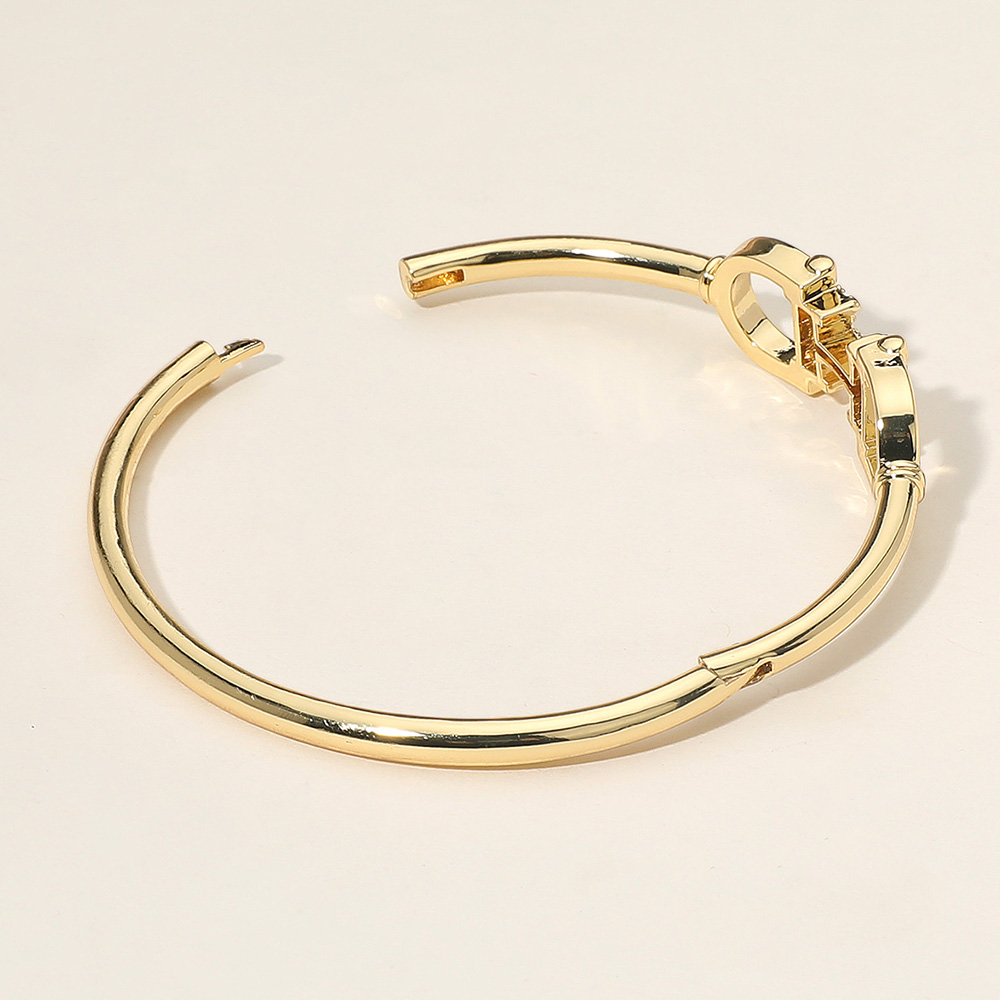 Details • Size : 0.5" H, 2.5" D • Hinged Closure • A polished bangle bracelet featuring a horsebit-inspired centerpiece adorned with sparkling crystal accents. Sleek and versatile, this hinged bracelet adds a refined touch to any jewelry collection, perfect for stacking or wearing on its own. • Lead and Nickel Compliant