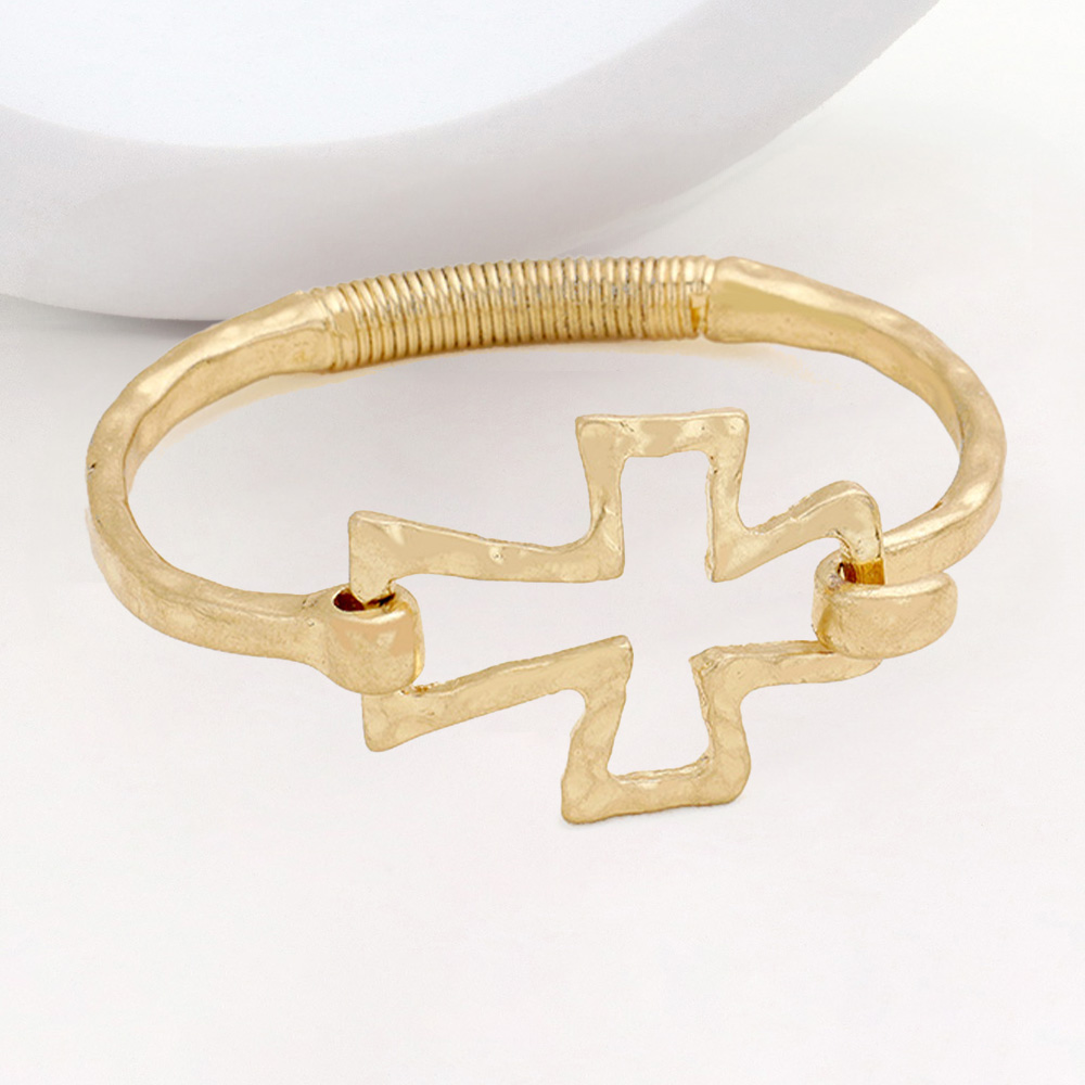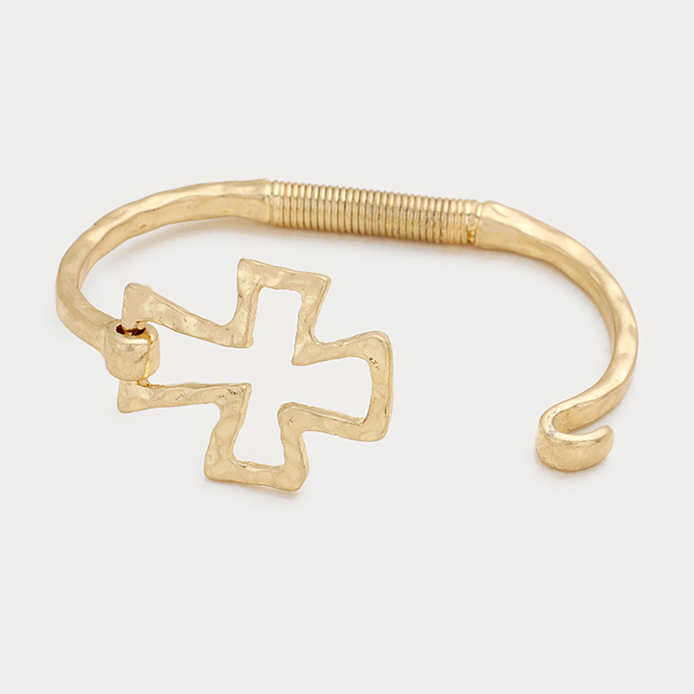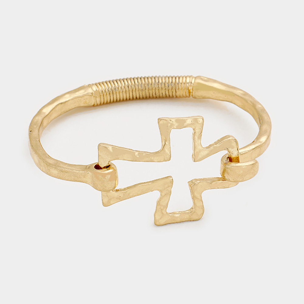 Details • Size : 1.25" H, 2.3" D • Hook Closure • Make a bold statement of faith and style with this hammered cross design stretch bangle bracelet. Its textured finish and open cross centerpiece blend rustic charm with modern simplicity, creating a timeless accessory perfect for daily wear or meaningful gifting. • Lead and Nickel Compliant