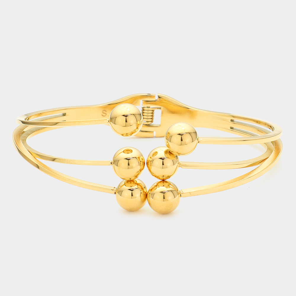 Details • Size : 1" H, 2.25" D • Hinged Closure • Elevate your look with this modern triple band bracelet featuring polished bead accents for a sleek, contemporary finish. Perfect for both casual and formal wear, it offers a refined balance of simplicity and sophistication, making it an ideal addition to any jewelry collection. • Lead and Nickel Compliant • Stainless Steel