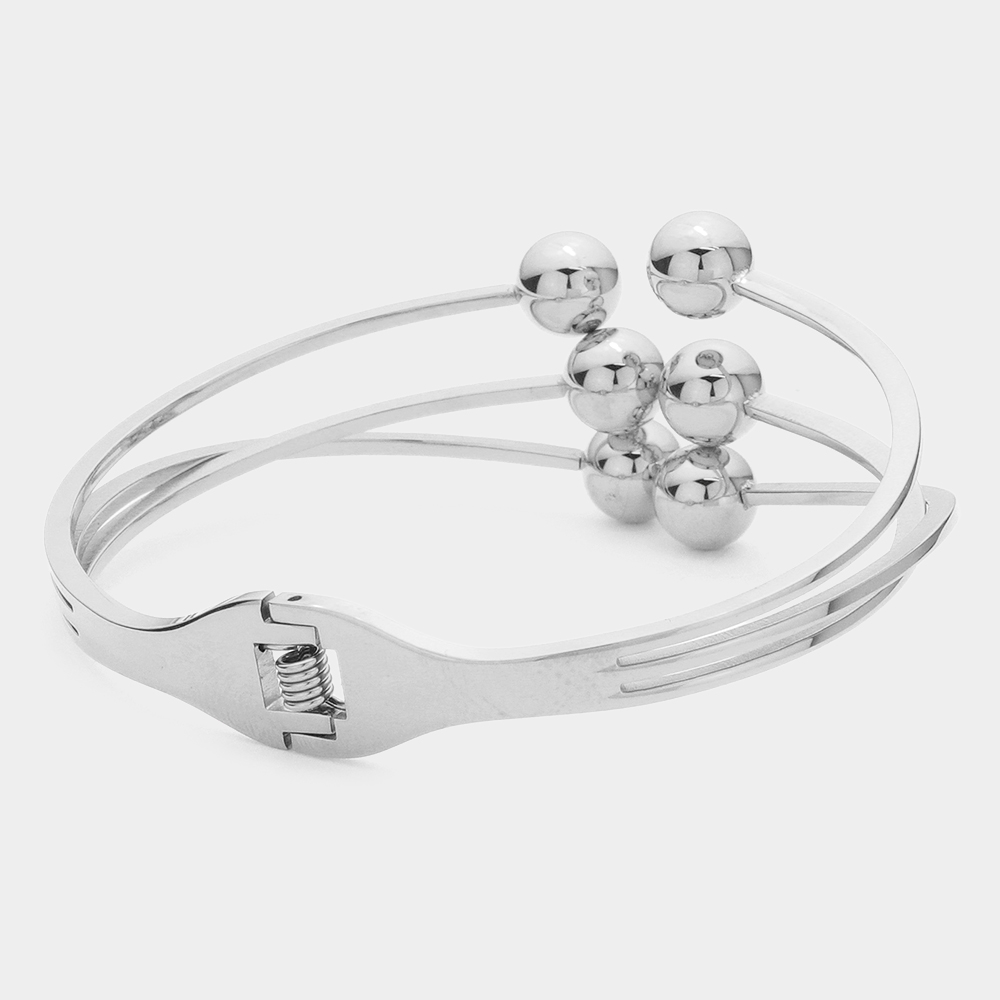 Details • Size : 1" H, 2.25" D • Hinged Closure • Elevate your look with this modern triple band bracelet featuring polished bead accents for a sleek, contemporary finish. Perfect for both casual and formal wear, it offers a refined balance of simplicity and sophistication, making it an ideal addition to any jewelry collection. • Lead and Nickel Compliant • Stainless Steel