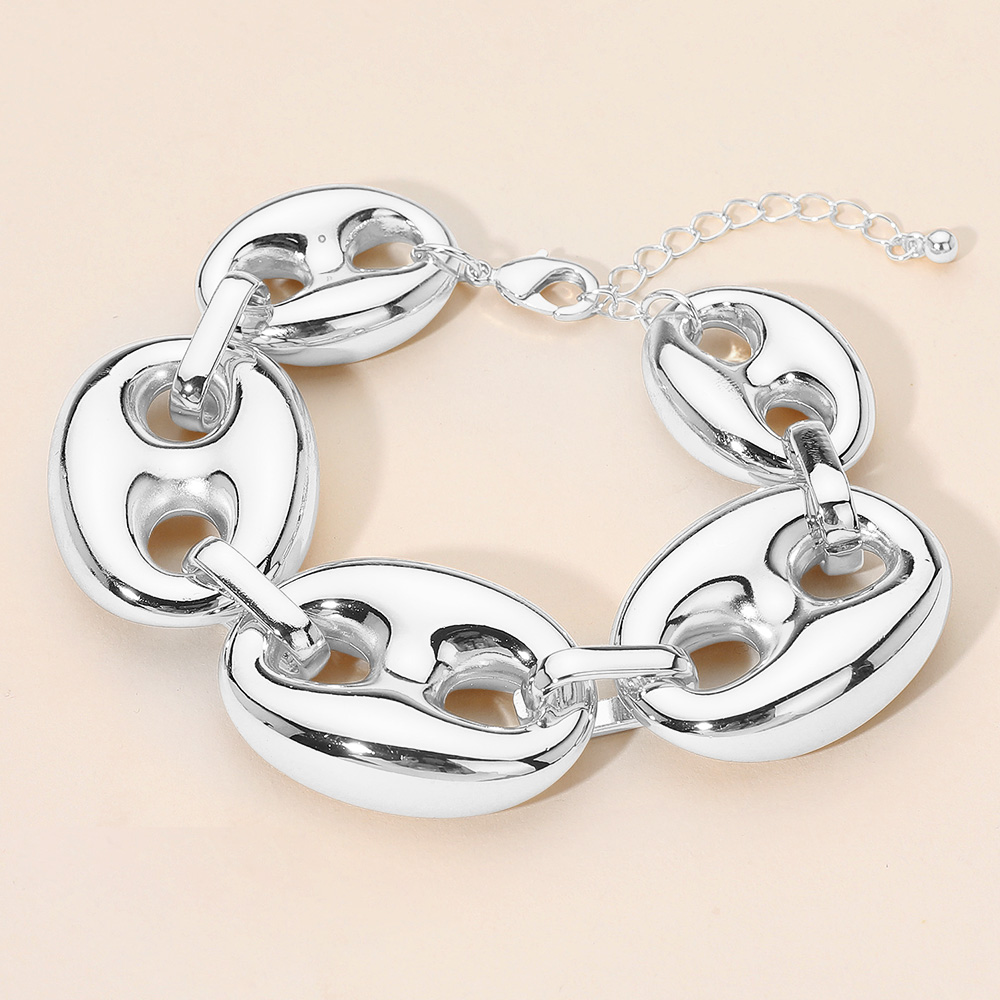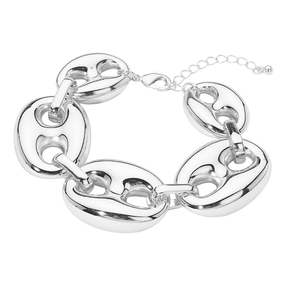 Details • Size : 1.2" H, 8.25" + 2" L • Lobster Clasp Closure • Turn heads with this statement link bracelet crafted with oversized oval links and a sleek polished finish. Its bold and modern design makes it a standout accessory, perfect for adding a touch of contemporary style to both casual and dressy outfits. • Lead and Nickel Compliant