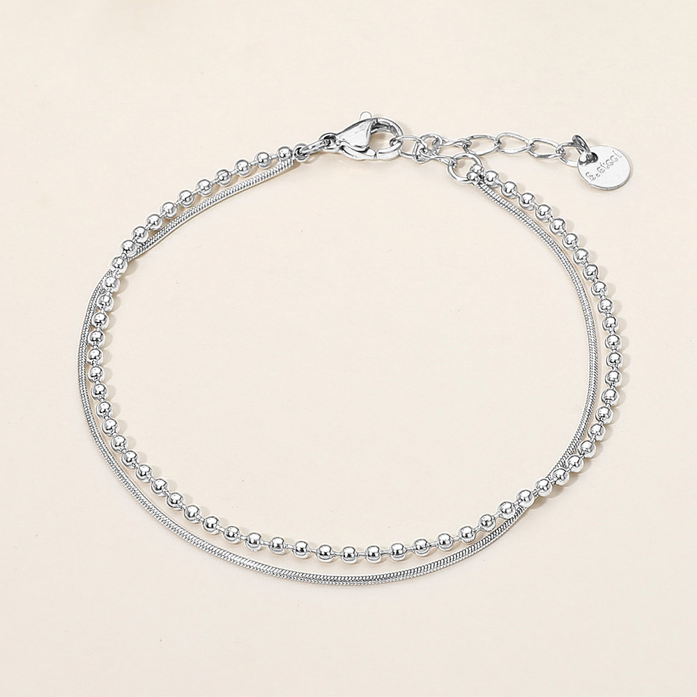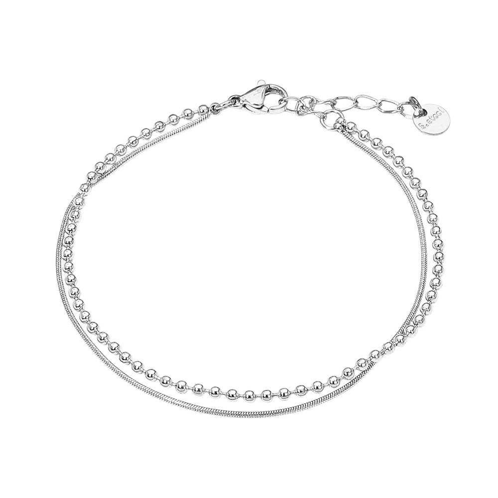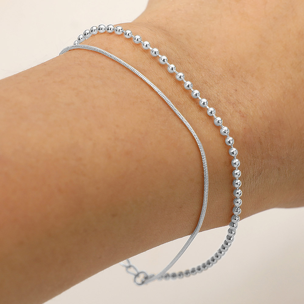 Details • Size : 0.2" H, 7" + 1.5" L • Lobster Clasp Closure • Water Resistant • This dual chain bracelet set combines a sleek snake chain with a classic beaded strand for a stylish layered effect. Lightweight and versatile, it adds refined elegance to everyday wear or special occasions, making it a must-have piece for effortless accessorizing. • Stainless Steel