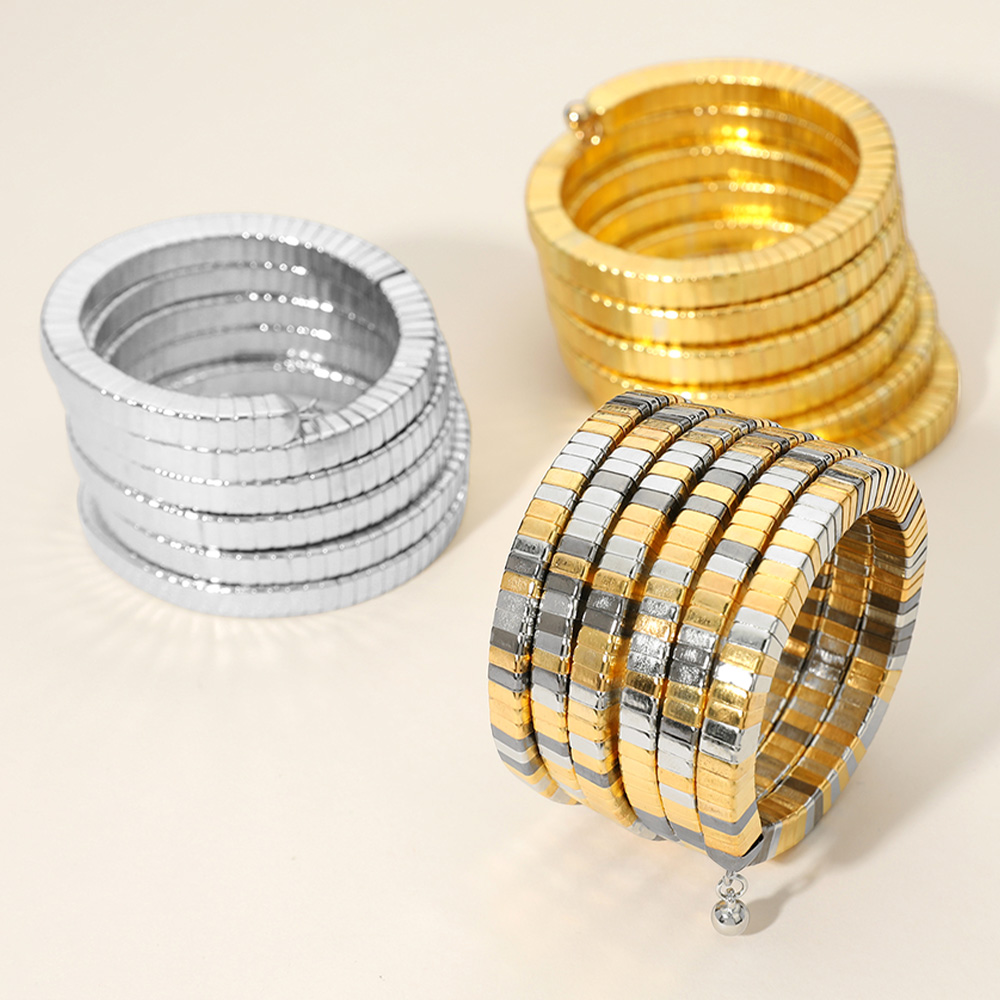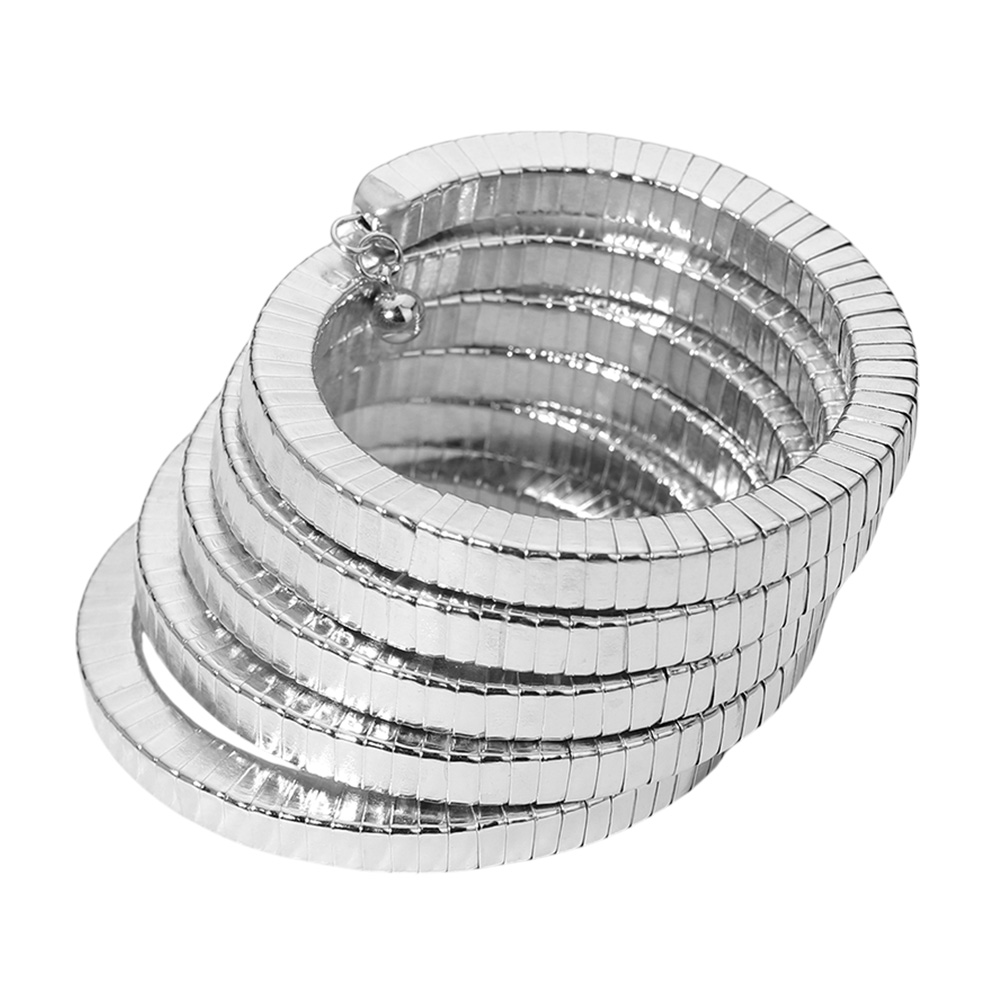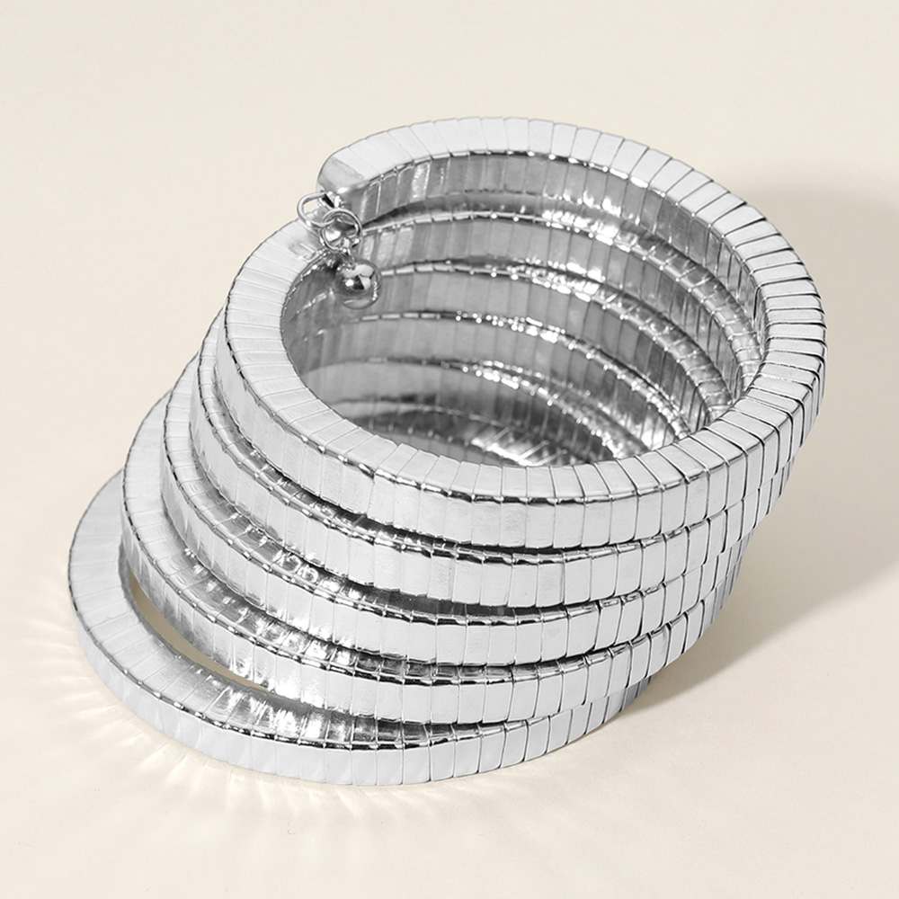 Details • Size : 1.8" H, 2.1" D • Adjustable • Elevate your style with this stacked coil bracelet featuring bold metallic tones in a modern striped design. Its flexible, adjustable coil wraps comfortably around the wrist, creating a striking layered effect that transitions effortlessly from casual looks to sophisticated evening wear. • Lead and Nickel Compliant
