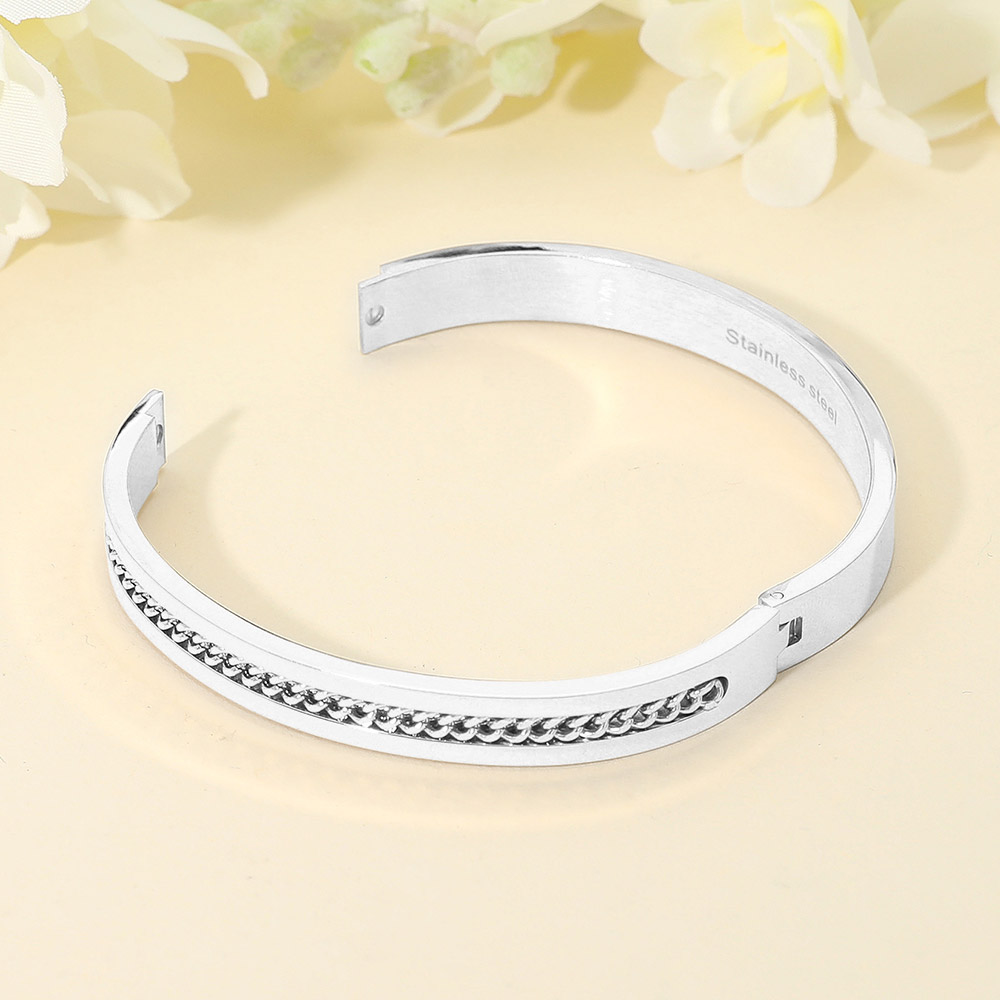 • This stainless steel bangle features a refined chain-inspired center framed by a sleek polished finish, blending strength and elegance. Designed for modern sophistication, it adds a subtle statement to any outfit, perfect for both everyday wear and effortlessly elevated occasions.