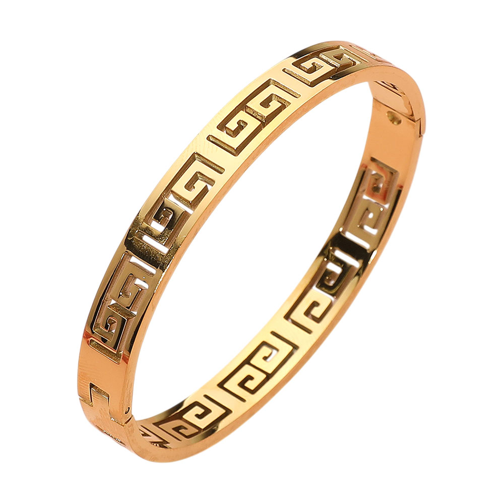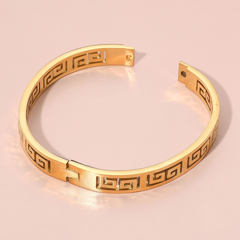 • Stylish bangle bracelet featuring a timeless Greek key pattern. Perfect for adding a touch of classic elegance to everyday wear or complementing formal and evening outfits.