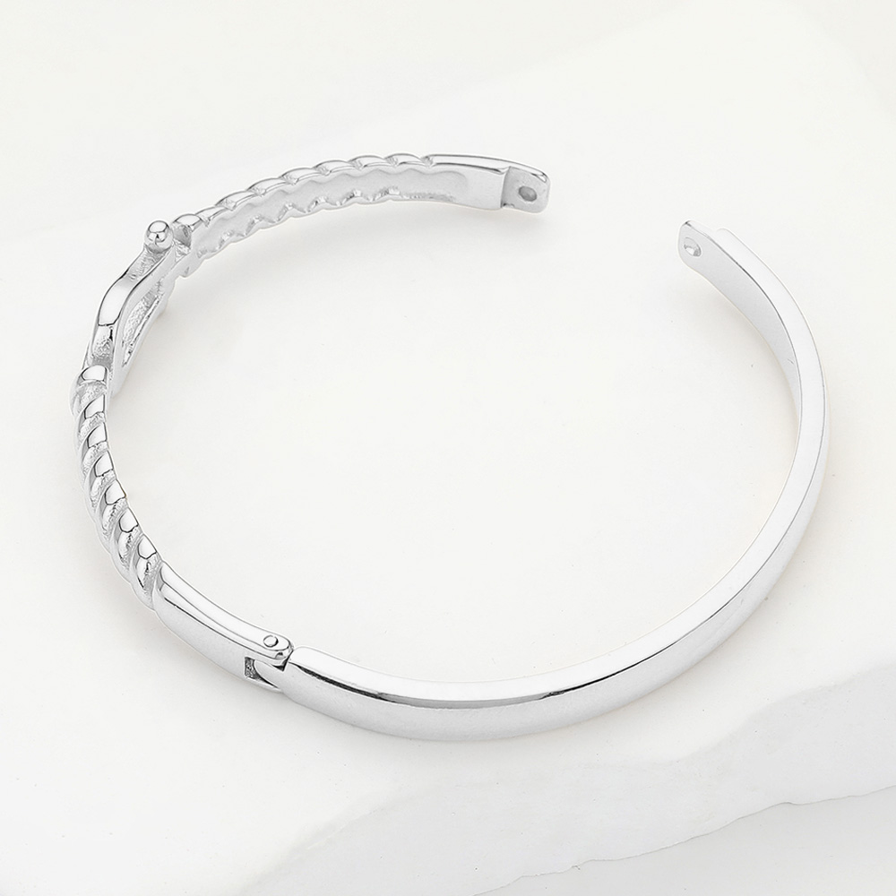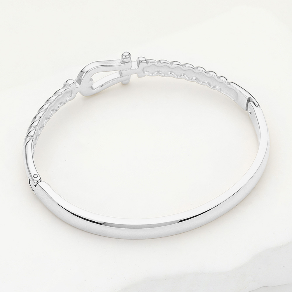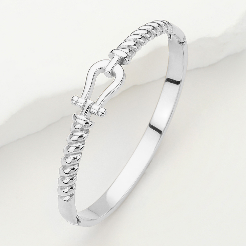 Details • Size : 0.4" H, 2.4" D • Hinged Closure • This stainless steel bangle features an elegant rope-inspired detail with a sleek clasp design, blending timeless style with modern sophistication. Its polished finish adds a luxurious touch, making it a versatile piece that complements both everyday outfits and refined evening looks. • Stainless Steel