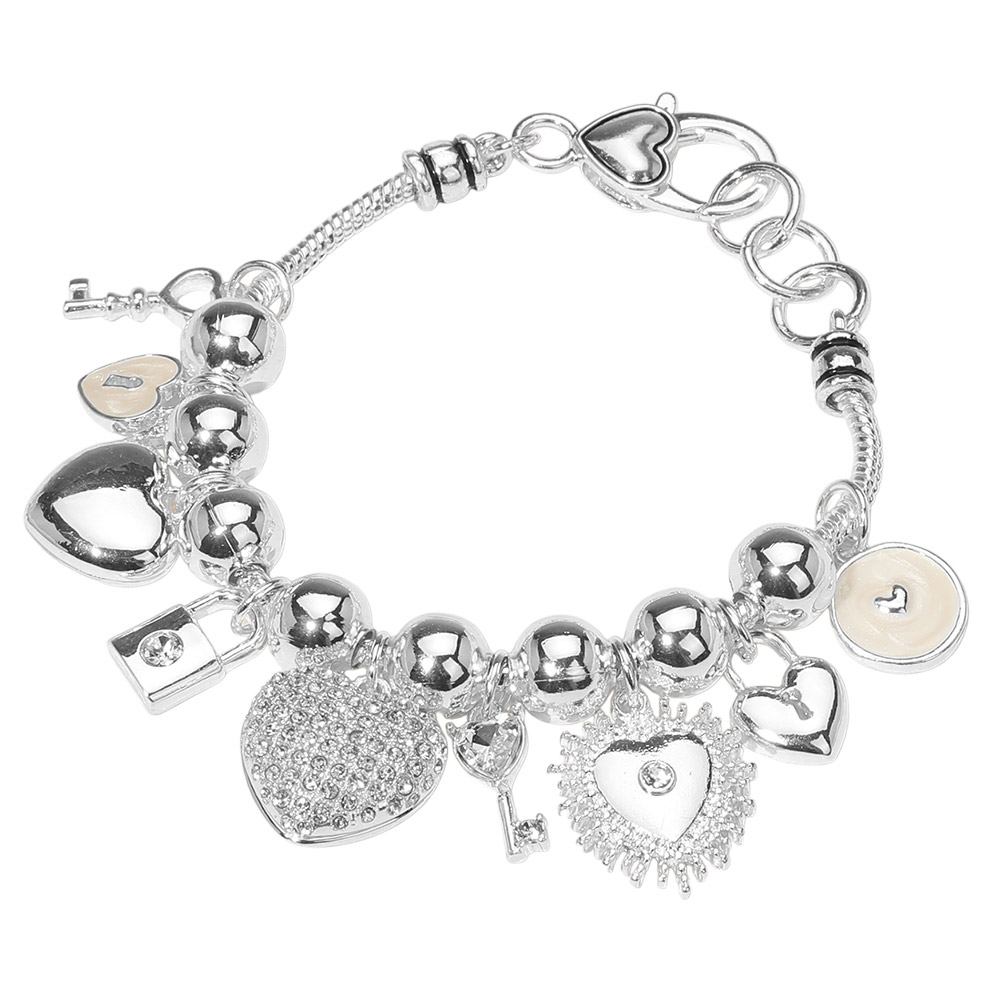 • Stylish charm bracelet featuring a mix of heart, key, and lock charms with polished beads. Adds a touch of sparkle and sentiment to any outfit, making it a perfect gift or fashion statement piece.