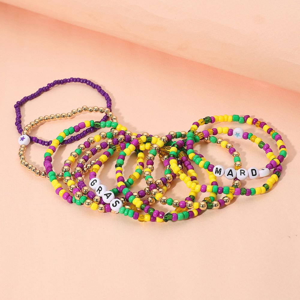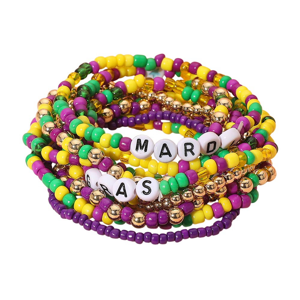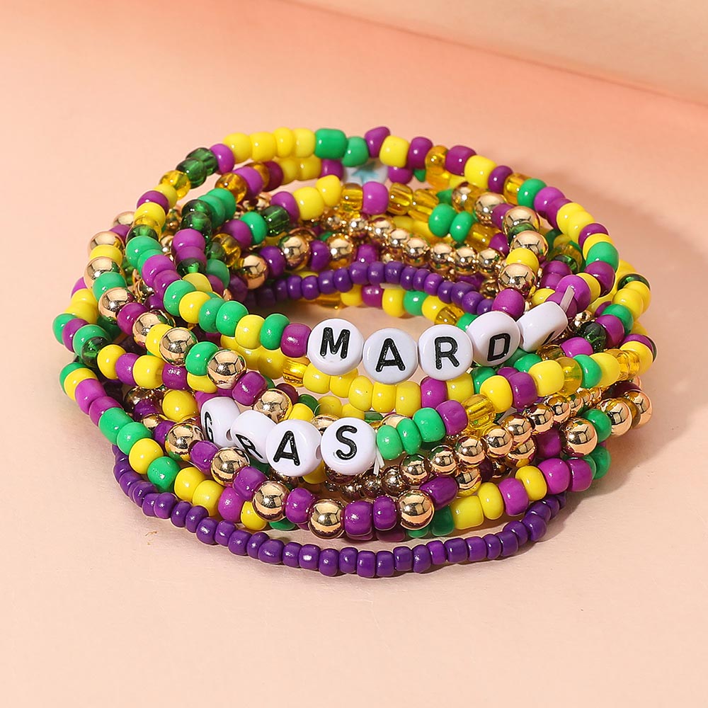 Details • Size : 1.75" H • Stretchable • Festive Mardi Gras beaded stretch bracelet set featuring multi-strand elastic bands with themed letter beads and vibrant festive accents. Perfect stackable accessory for holiday events, parties, parades, and celebration outfits. • Lead and Nickel Compliant