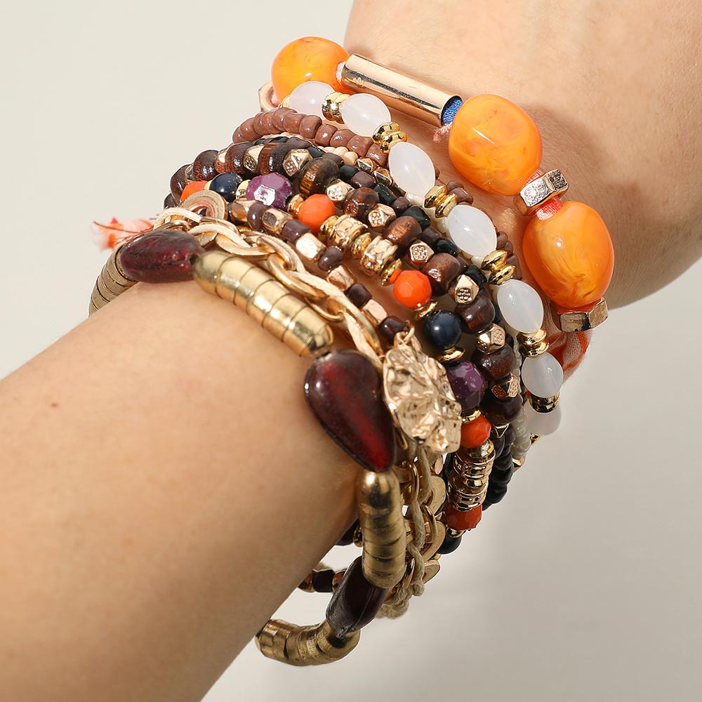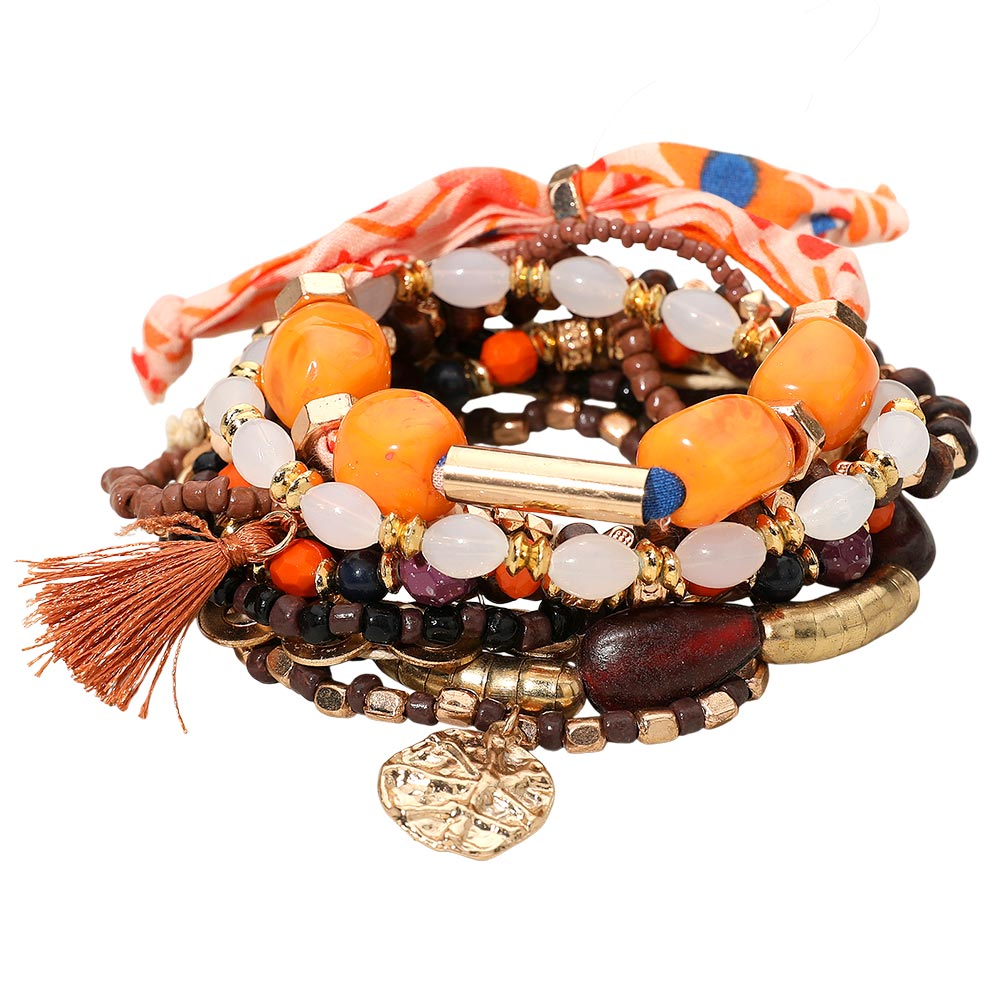 Details • Size 1 : 1.5" H / Stretchable • Size 2 : 0.8" H / Adjustable • Elevate your style with this vibrant boho bracelet stack featuring an eclectic mix of beads, bold accents, playful charms, and a soft fabric tie. Designed for effortless layering, it adds lively detail and artistic flair to everyday looks or standout outfits. • Lead and Nickel Compliant • Made In India