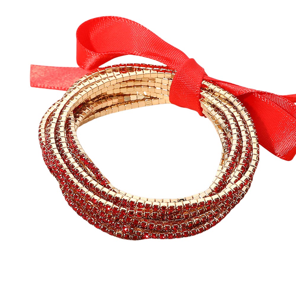 • Elegant layered stretch bracelet set featuring multiple slim bands tied together with a decorative ribbon. The stackable circular design adds texture and shine, perfect for both casual layering and festive occasions.
