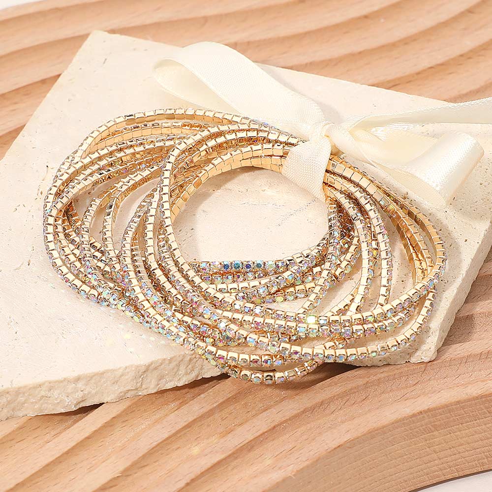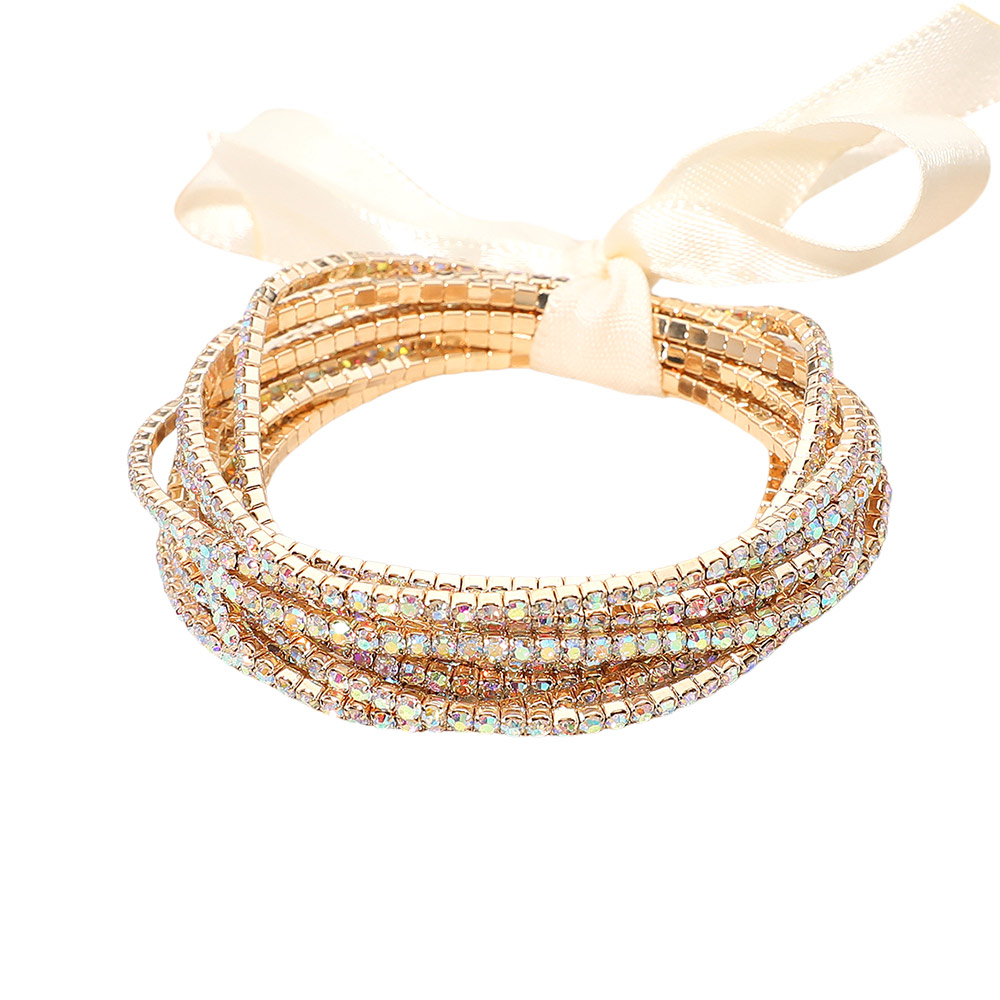 12PCS - Ribbon Slim Rhinestone Stretch Multi Layered Bracelet